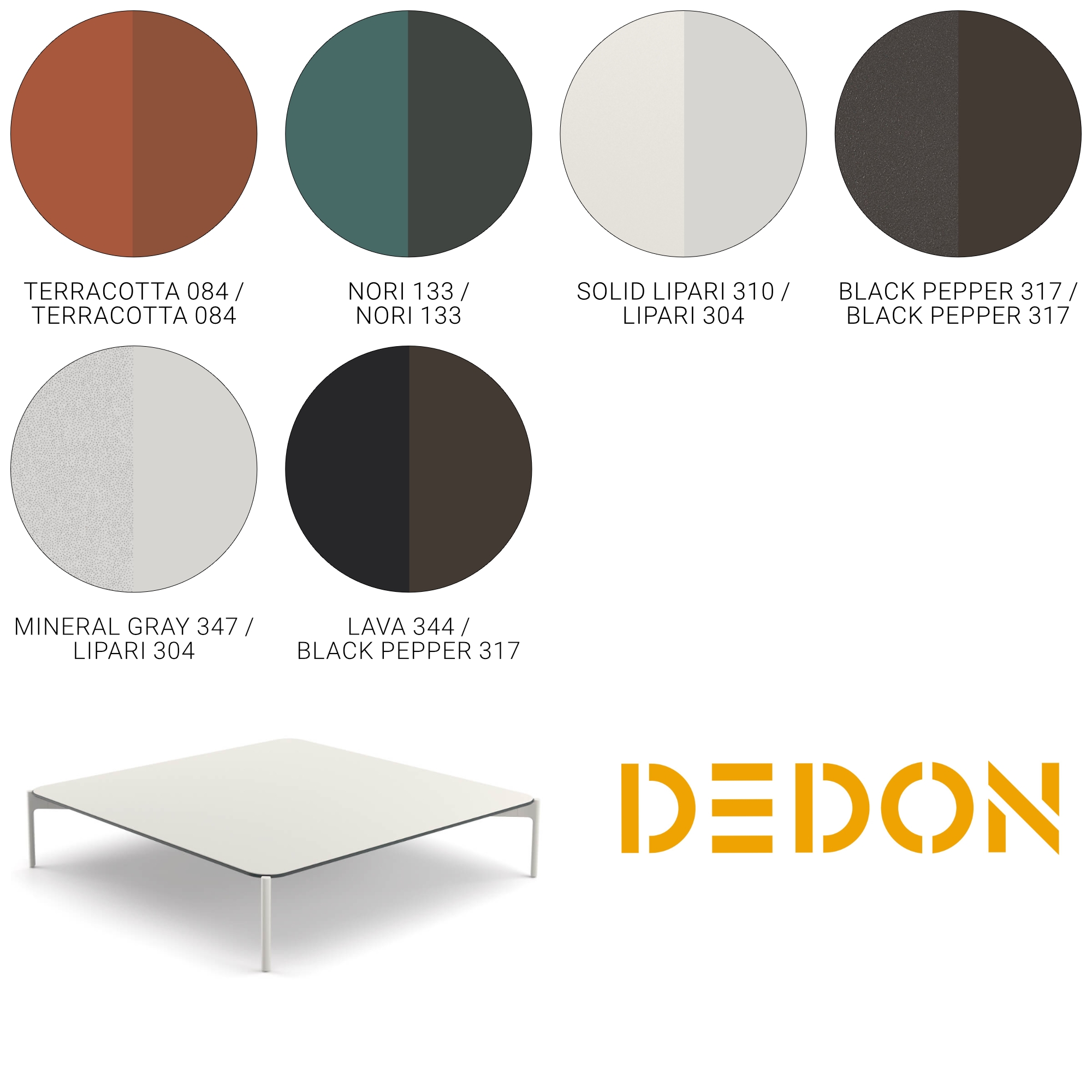 Die Tische sind mit einer Glas-, HPL- oder Keramiktischplatte erhältlich. HPL ist ein Material, das sich durch hohe Stoßfestigkeit und extreme Widerstandskraft gegen mechanische Einwirkungen, Feuchtigkeit und Dampf auszeichnet. Die DEDON HPL Tischplatten bestehen aus mit Harz getränkten Papierschichten. Da die Papierschichten ein Naturprodukt sind, kann es produktionsbedingt zu gewissen Farbabweichungen kommen. Die Keramik-Tischplatten bestehen aus Feinsteinzeug – einer hochwertigen Hochleistungskeramik, die durch das Sintern von Mineralpulvern ganz ohne synthetische Harze entsteht. Sie zeichnen sich durch eine hohe Widerstandsfähigkeit gegenüber Wasser, Frost, UV-Strahlung und Abrieb aus und sind somit ideal für den Einsatz im Außenbereich geeignet. Das Einscheibensicherheitsglas bietet eine verbesserte Temperaturwechselbeständigkeit sowie eine hervorragende Biege-, Schlag- und Stoßfestigkeit. Der Rahmen besteht aus pulverbeschichtetem Aluminium. Mit einem weichen, sauberen Tuch und warmem Wasser reinigen.