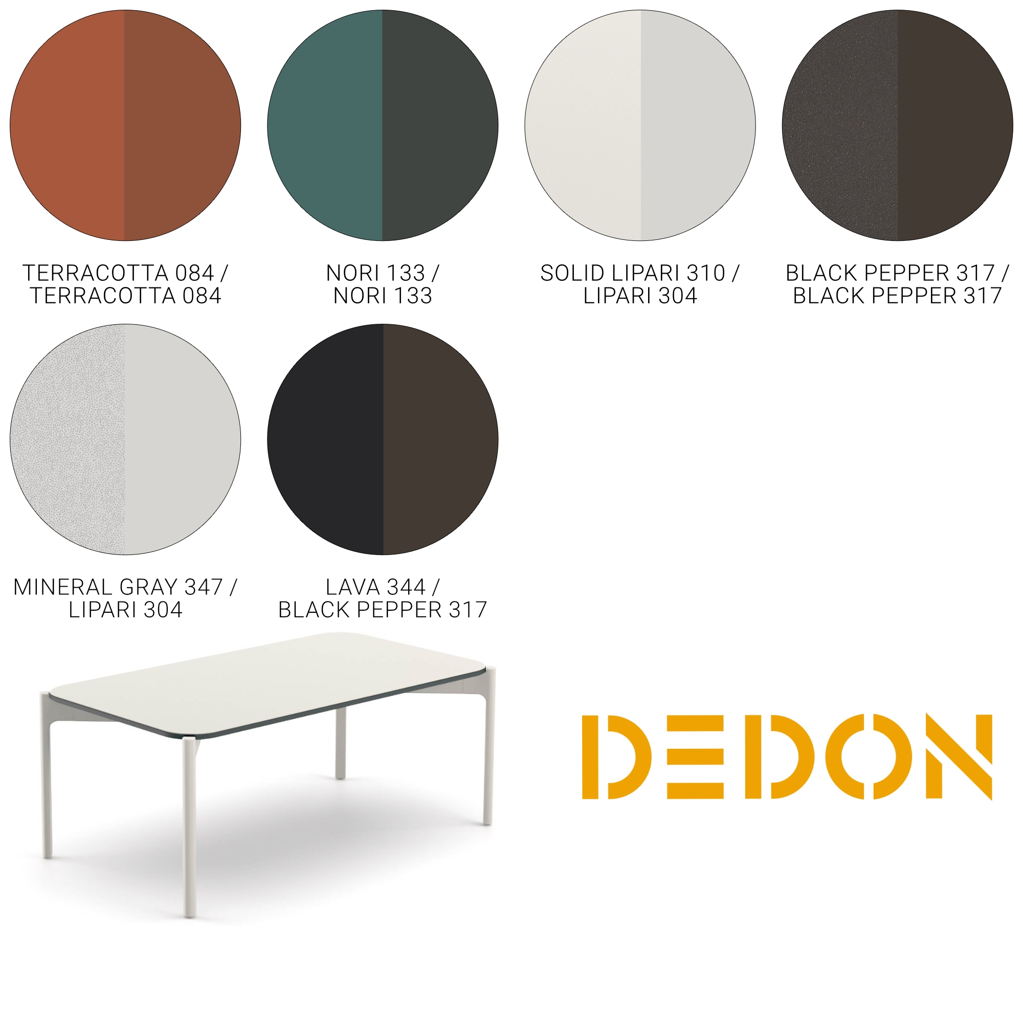 Die Tische sind mit einer Glas-, HPL- oder Keramiktischplatte erhältlich. HPL ist ein Material, das sich durch hohe Stoßfestigkeit und extreme Widerstandskraft gegen mechanische Einwirkungen, Feuchtigkeit und Dampf auszeichnet. Die DEDON HPL Tischplatten bestehen aus mit Harz getränkten Papierschichten. Da die Papierschichten ein Naturprodukt sind, kann es produktionsbedingt zu gewissen Farbabweichungen kommen. Die Keramik-Tischplatten bestehen aus Feinsteinzeug – einer hochwertigen Hochleistungskeramik, die durch das Sintern von Mineralpulvern ganz ohne synthetische Harze entsteht. Sie zeichnen sich durch eine hohe Widerstandsfähigkeit gegenüber Wasser, Frost, UV-Strahlung und Abrieb aus und sind somit ideal für den Einsatz im Außenbereich geeignet. Das Einscheibensicherheitsglas bietet eine verbesserte Temperaturwechselbeständigkeit sowie eine hervorragende Biege-, Schlag- und Stoßfestigkeit. Der Rahmen besteht aus pulverbeschichtetem Aluminium. Mit einem weichen, sauberen Tuch und warmem Wasser reinigen.