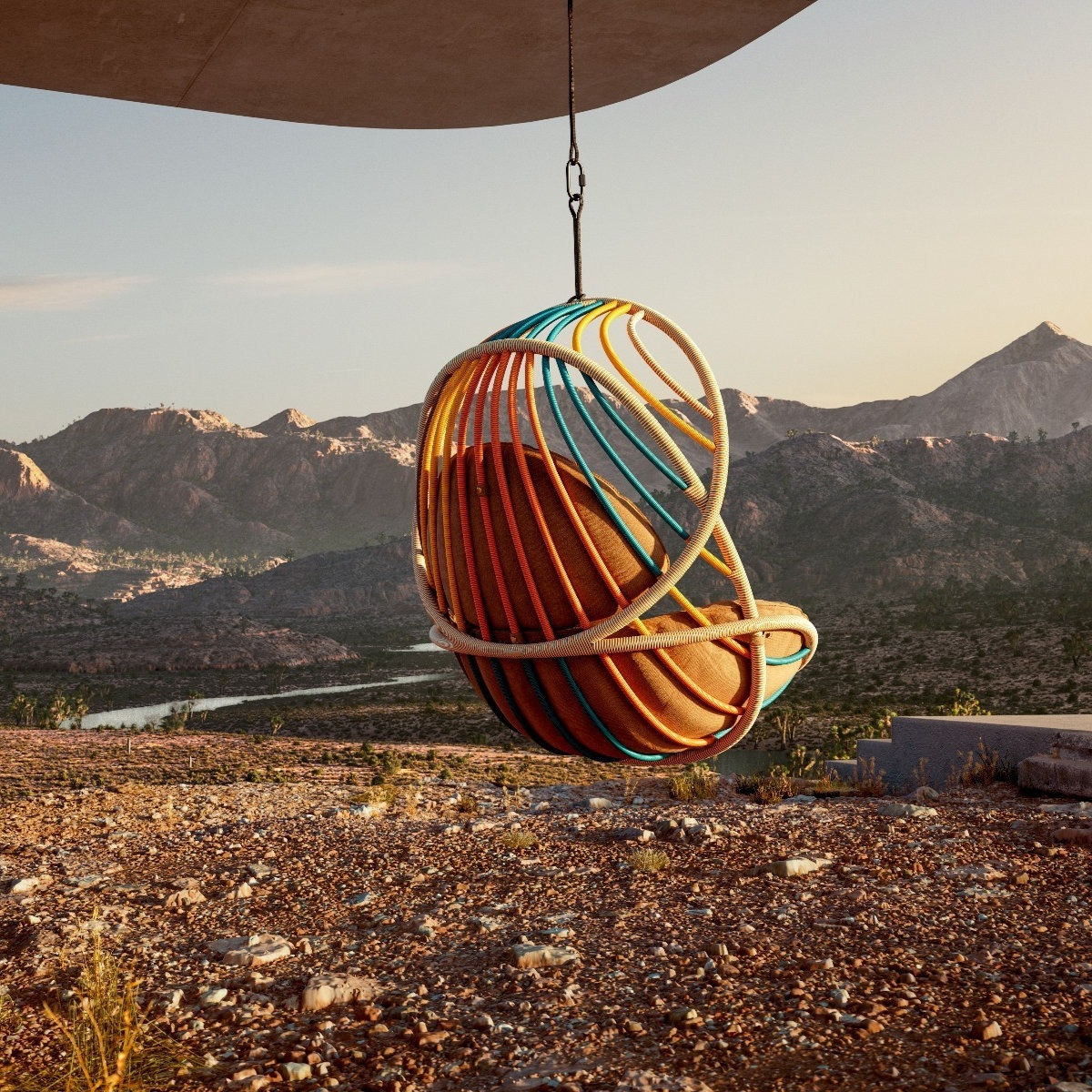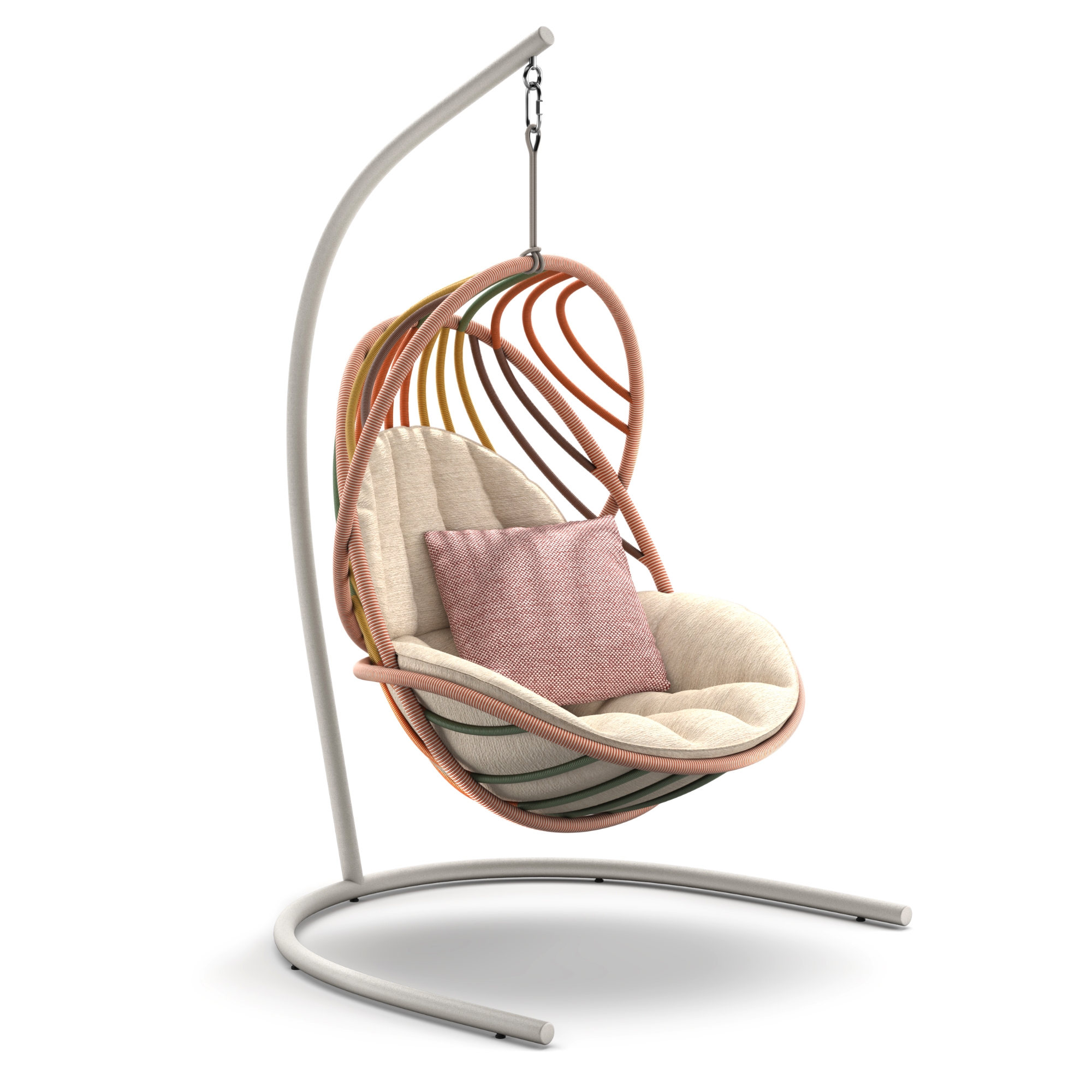 Mit KIDA hat Stephen Burks einen Hängesessel entworfen, der sowohl optisch als auch in der Nutzung reizvoll ist. Als erste Kollektion, die nicht in DEDON Faser geflochten, sondern gewickelt wurde, weist der KIDA Hängesessel eine wiegenartige, organische Form auf, die offen, luftig, leicht und einladend ist. Einmal im Sessel sitzend, bietet KIDAs Kissen, das die gesamte Sitzfläche bedeckt, einen unvergleichlichen Komfort. Beim Schwingen entsteht nach Burks eigenen Worten das Gefühl „so frei wie der Wind“ zu sein. Mit seinem organisch geformten Rahmen aus pulverbeschichtetem Aluminium ist KIDA leicht und dennoch außergewöhnlich stabil. Umhüllt von der innovativen DEDON Fiber Touch, die eine besonders weiche Haptik aufweist, wird die Kollektion in drei gestreiften Farbvarianten angeboten, darunter das lebhafte, mehrfarbige Glow Touch. Stephen Burks über die Farbpalette: „Als ich sah, wie raffiniert die neuen Farbentwicklungen von DEDON sind und wie erfolgreich sie die gesamte DEDON-Kollektion miteinander verbinden, ergriff ich die Chance, so viel von der neuen Palette in mein neues Projekt zu integrieren wie möglich. Die Logik in diesem Design ist die Umwicklung des graphischen Rahmens, die Farbgebung geschah eher zufällig.“ KIDA verfügt über ein extraweiches Sitz- und Rückenkissen, das perfekt zum Liegen und Entspannen positioniert ist.