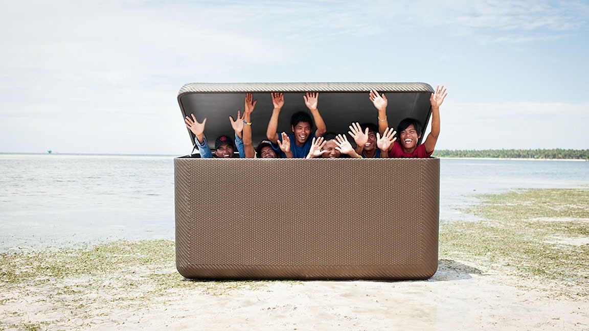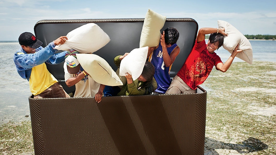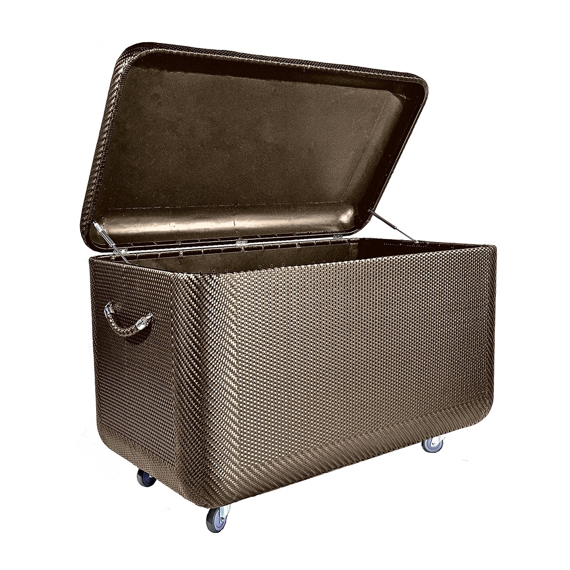 Die handgeflochtene LA MALLE Truhe wurde designt, um eine attraktive, unaufdringliche und effiziente Lösung zur Unterbringung all Ihrer DEDONKissen zu bieten. Sie besitzt einen Deckel mit Gasdruckfedern, Leichtlaufrollen, atmungsaktives Ferrari Batyline®-Innenfutter und eine speziell gestaltete Belüftung, die das Innere von Feuchtigkeit freihält. Die bronzefarbene Truhe ist im überdachten Außenbereich sowie im Innenbereich einsetzbar.
