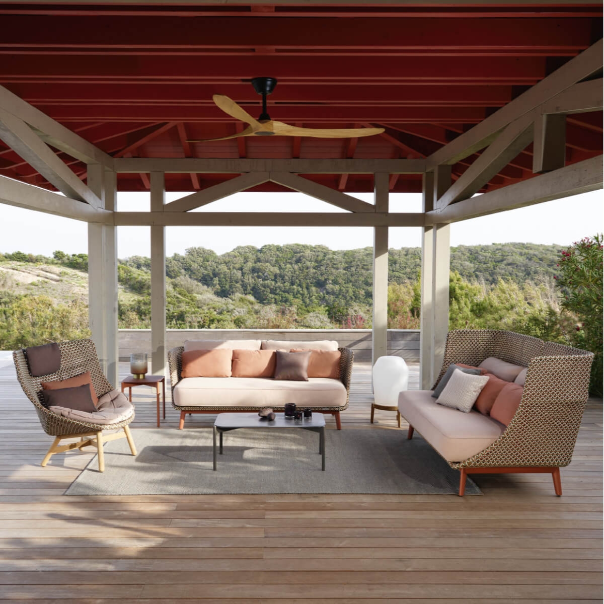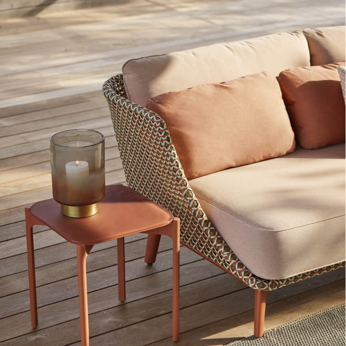 "Das ist eine Sensibilität und Identität meiner Arbeit, die die Funktion, das Material und das Detail hervorhebt." - Sebastian Herkner. Mit seinen weitläufigen Rückenlehnen und tiefen Sitzgelegenheiten umgibt MBARQ von Sebastian Herkner die Benutzer mit Privatsphäre undschützenden Komfort. Inspiriert von der traditionellen Form der Nische im Innenbereich, gibt die modulare Kollektion Struktur, um dieAußenräume, die Bereiche definieren, in denen man arbeiten, sich ausruhen oder sich unterhalten kann. Mit seinem pulverbeschichteten Aluminiumrahmen - wahlweise in Terracotta, Nori oder Lipari - ist MBARQ leicht, robust und wetterfest. Die Möbel der MBARQ-Kollektion bestehen aus DEDON-Faser, die auf einem pulverbeschichteten Aluminiumrahmen geflochten ist. Für MBARQ verwenden wir dasselbe offene und lebendige, dreiachsige Webmuster wie für unsere MBRACE-Serie. Einfach mit einem weichen Tuch und warmem Wasser zu reinigen. Zwei sich gegenüberstehende Sofas lassen einen offenen Raum entstehen — mitten in der Natur. Inspiriert von der Form historischer Alkoven, transportierte Sebastian Herkner die Idee des Rückzugsraums mit MBARQ ins Freie. Die tiefen Sitzflächen und hohen Rückenlehnen bieten nicht nur Komfort, sondern auch Privatsphäre. Die modulare Kollektion verleiht offenen Außenräumen Struktur und definiert Bereiche, in denen man sich sowohl entspannen und unterhalten als auch konzentriert arbeiten kann. Durch die organische Form, die lebendigen Farben und die dreiachsige Flechtstruktur aus DEDON-Faser verleiht MBARQ jeder Umgebung einen verwunschenen Touch und lädt zum Träumen ein. Als Sebastian Herkner MBARQ entwickelte, wollte er einen Ort schaffen, an dem man sich sowohl entspannen und unterhalten als auch konzentriert arbeiten kann. Der Designer ließ sich dabei von der traditionellen Form eines Alkovens inspirieren und transportierte diese Idee ins Freie. Gemeinsam mit dem renommierten Farbenspezialisten Giulio Ridolfo erschuf Sebastian Herkner durch das Zusammenspiel von drei verschiedenfarbigen DEDON-Fasern eine verspielte und edle Farbwelt.