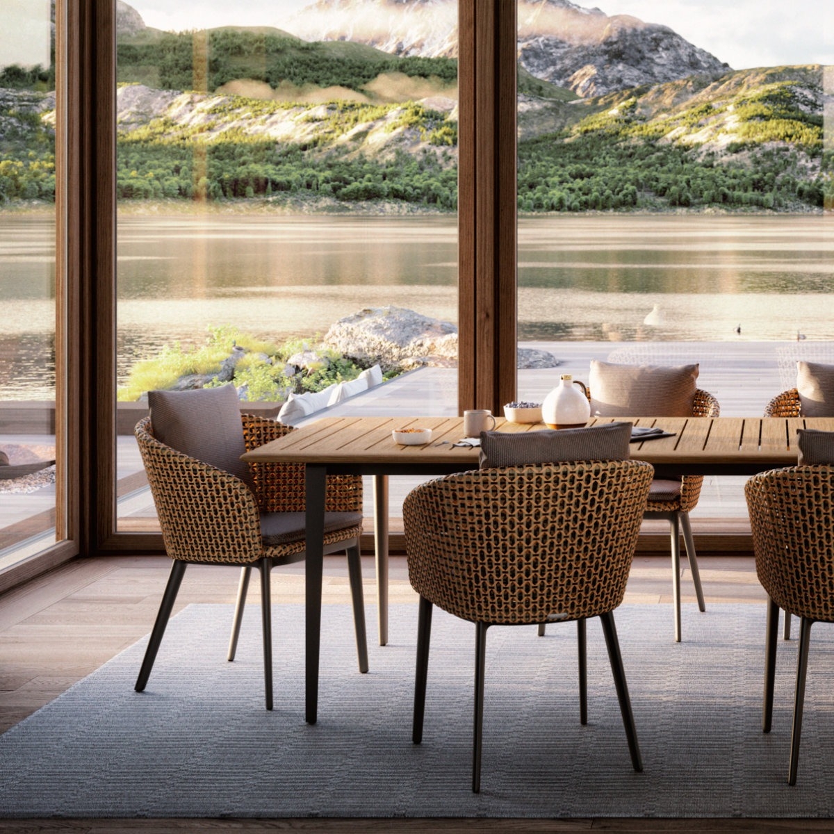 MBRACE von Sebastian Herkner — das sind ikonischer Stil und ein überzeugender Materialmix. Die Kollektion bietet einen frischen optischen Impuls und ist damit noch vielseitiger einsetzbar. Der Ausgangspunkt für Herkners preisgekrönte Kollektion war der Material- Mix aus mehrfarbigen DEDON Fasern und edlem, warmem Teakholz.