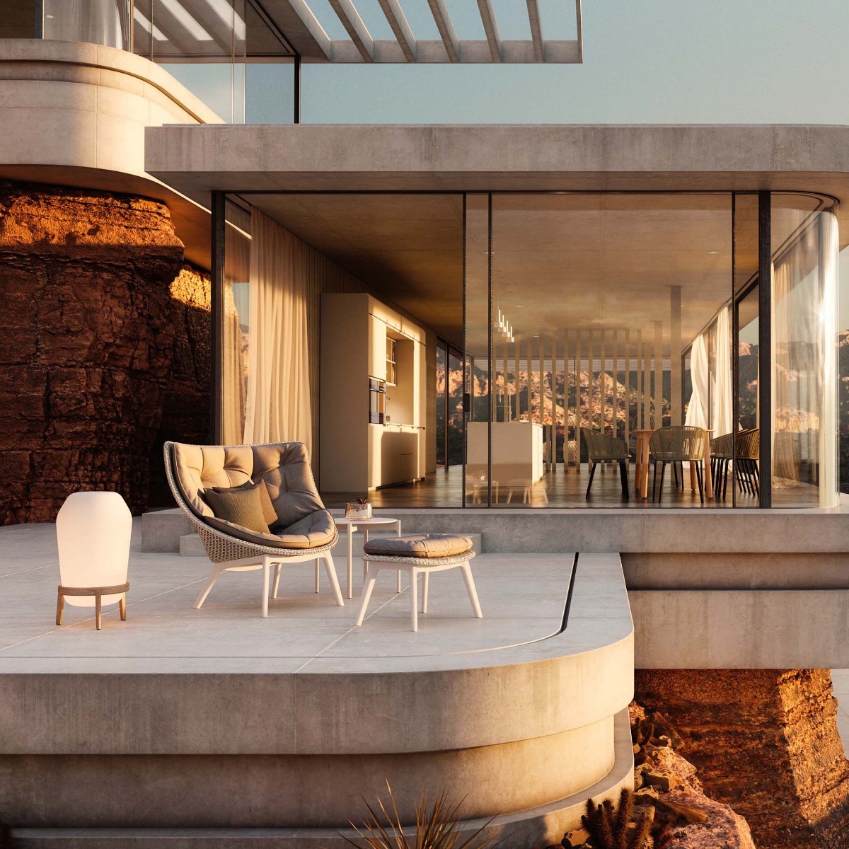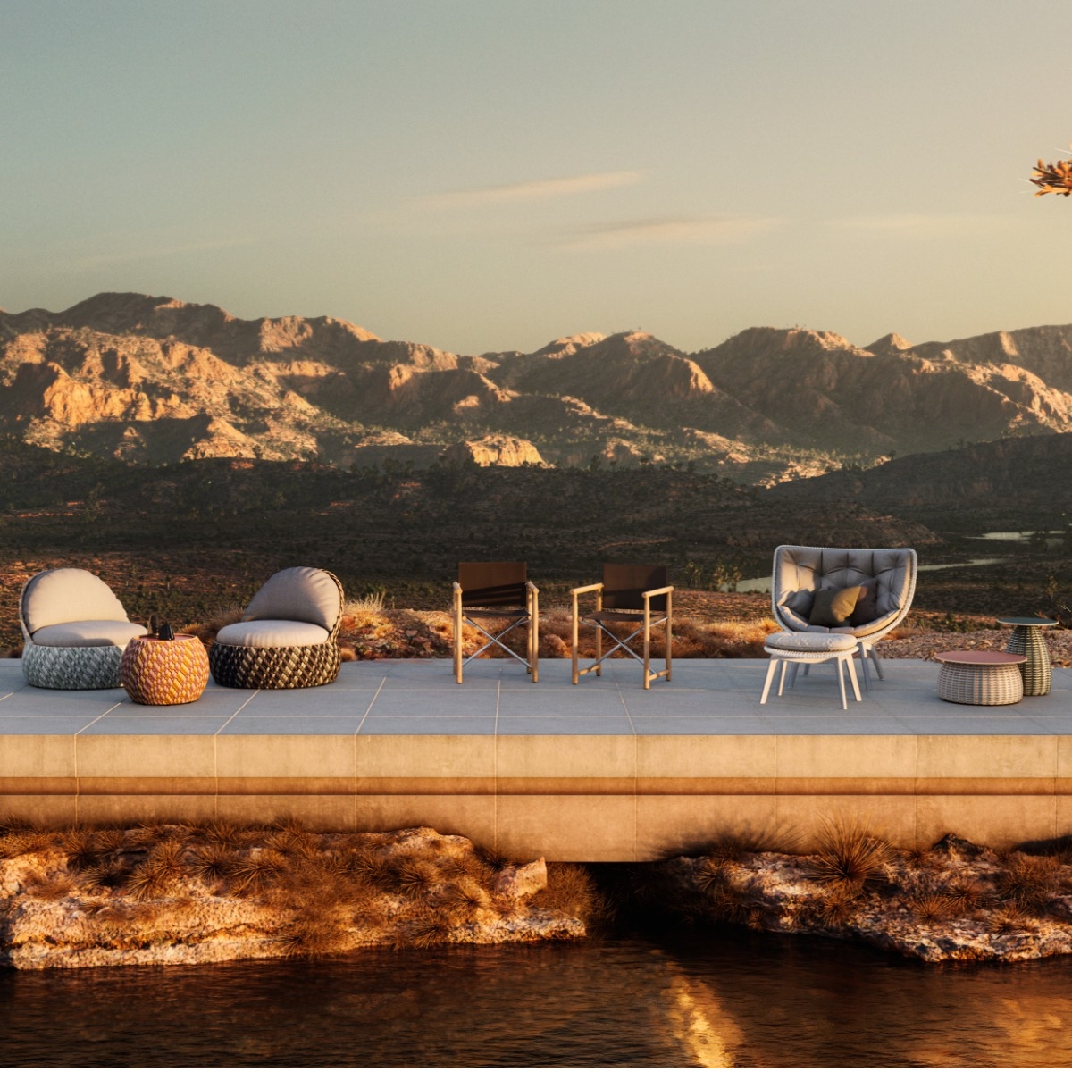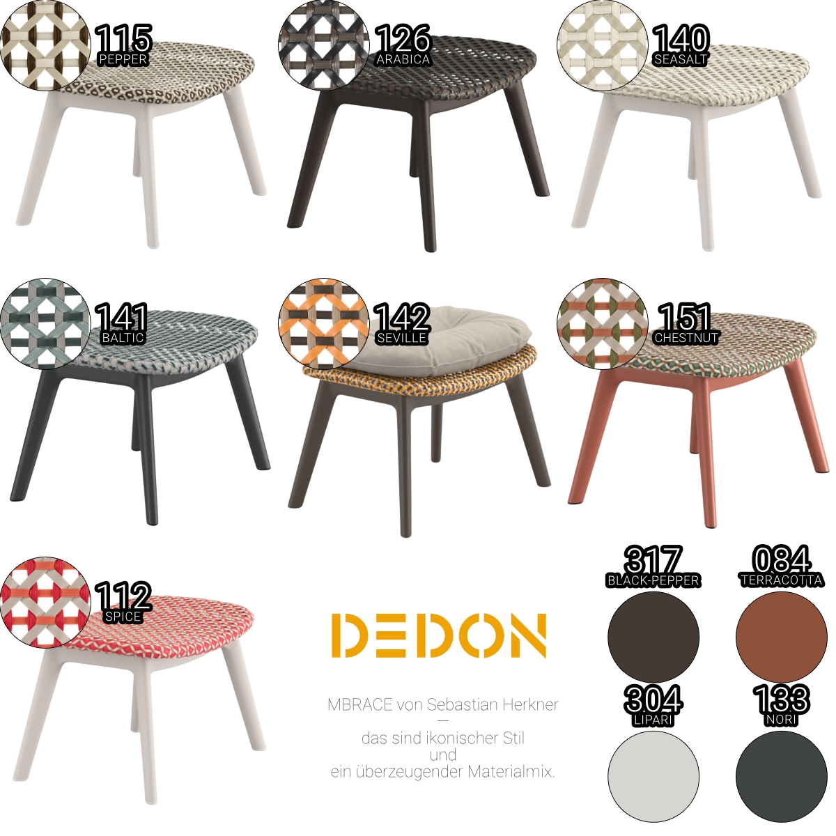 Die Geflecht- und Gestellfarben sind frei kombinierbar! Auf den Fotos sehen sie die beliebtesten Kombinationen. MBRACE von Sebastian Herkner — das sind ikonischer Stil und ein überzeugender Materialmix. Neben der Kombinationsmöglichkeit aus Premium Teakholz und der DEDON Faser, steht auch ein im Druckgussverfahren hergestelltes Aluminiumuntergestell zur Auswahl. Das Untergestell steht für den Hochlehner, Sessel, Hocker und Armlehnstuhl der MBRACE Kollektion zur Verfügung. Die Kollektion erhält damit einen frischen optischen Impuls und ist damit noch vielseitiger einsetzbar. Der Ausgangspunkt für Herkners preisgekrönte Kollektion war der Material- Mix aus mehrfarbigen DEDON Fasern und edlem, warmem Teakholz oder elegantem, glatten Aluminium. „Ich wollte die traditionelle Flechttechnik nutzen“, erklärt der Designer, „um ein Design zu erschaffen, das einer Geste gleicht — und zwar einer Umarmung.“ Um diese Umarmung unmittelbar erlebbar zu machen schuf Herkner ein Outdoormöbel, das auch ohne Polster ästhetisch brilliert und dabei ausgesprochen bequem ist. In Zusammenarbeit mit dem renommierten Farbberater Giulio Ridolfo haben Herkner und DEDON einzigartige Farbkombinationen für die Kollektion entwickelt. Alle Stühle und Sessel sind mit optionalen Kissen und breiten Rückenlehnen für höchsten Komfort ausgestattet. Die MBRACE-Esstische aus massivem Premium-Teakholz bieten mit ihrer außergewöhnlich schmalen Form den perfekten Rahmen für ein Zusammensein im Freien.