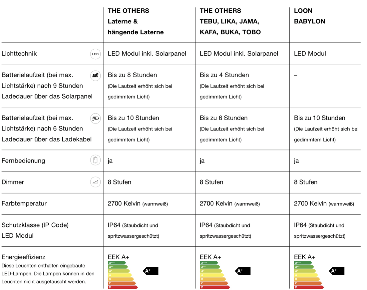 Diese Leuchte ist ein dekoratives Objekt für den Innen- und Außenbereich mit einer warmweißen Farbtemperatur (2700 Kelvin). LED-Modul: Das LED-Modul hat die Schutzklasse IP64 gegen Eindringen von Wasser und Schmutz, ist also staubdicht und spritzwassergeschützt und somit absolut geeignet für den Einsatz im Außenbereich. Aufladen lassen sich die LED-Module auf zweierlei Arten: über Solarmodule oder ein Netzkabel. Energieeffizienzklasse EEK A+. Die Leuchten enthalten eingebaute LED-Lampen, die nicht ausgetauscht werden können. Lieferung mit 230V Standardstecker (Europa) oder 120V Standardstecker (USA). MATERIAL Die Elemente der THE OTHERS Kollektion bestehen aus DEDON-Faser, Premium-Teak, italienischem Marmor und Acrylmosaik. Reinigen Sie Teakholz Elemente mit DEDON Teak Reiniger. Um den ursprünglichen goldbraunen Farbton zu bewahren, tragen Sie mindestens alle sechs Monate das DEDON Teak Öl auf.