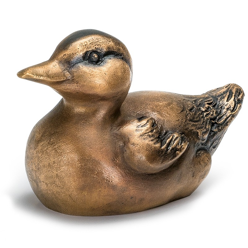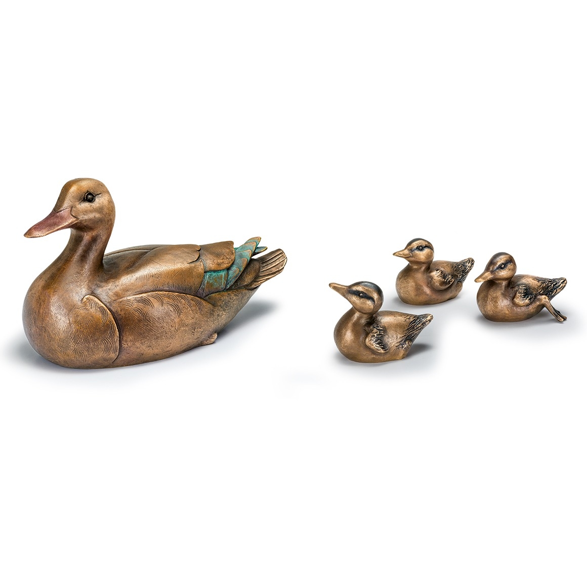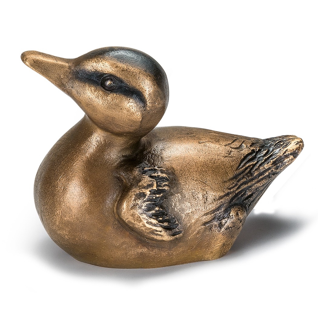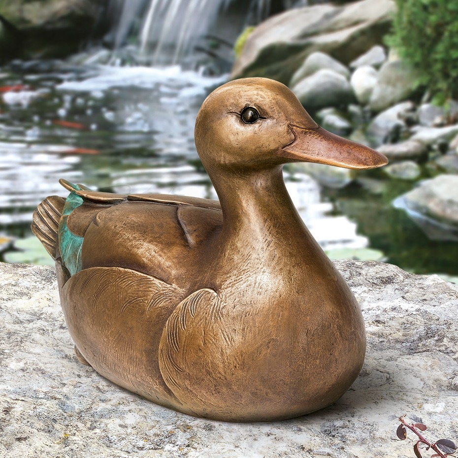 Der Gartenteich ist ihr Revier: Langsam zieht die Ente ihre Bahnen. Und wer mag, kann die lebensecht wirkende Bronzeskulptur mit den in Größe und Gestaltung zu ihr passenden Küken zur stolzen Entenmutter machen, der die Jungtiere als aneinandergeschmiegte Gruppe oder als Einzeltiere folgen – lautlos und ohne aufgeregtes Geschnatter und von Raubtieren aller Art höchst unbeeindruckt.