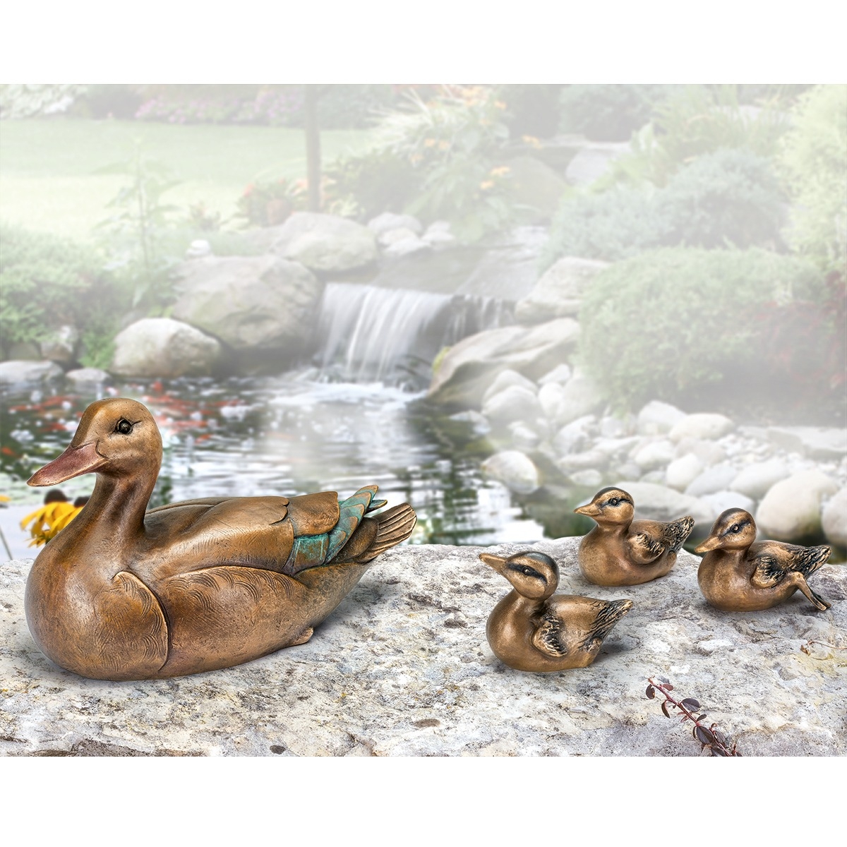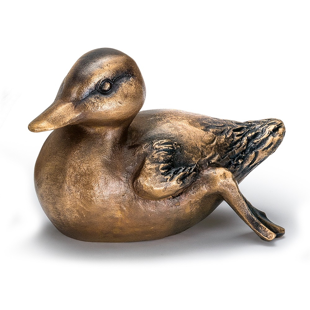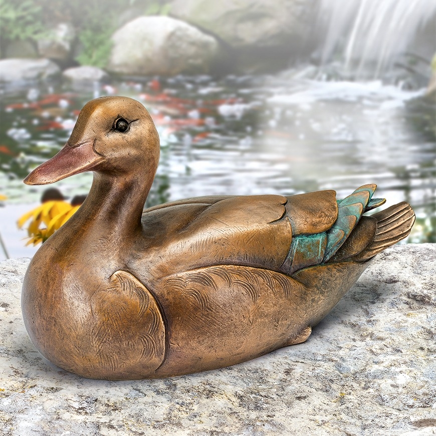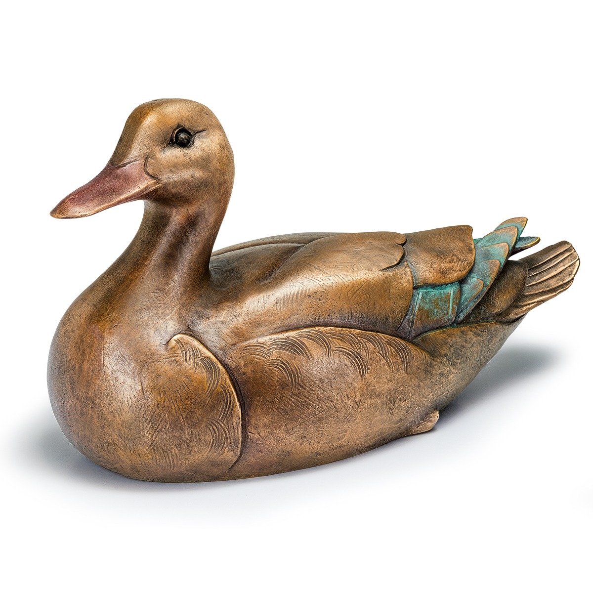 Der Gartenteich ist ihr Revier: Langsam zieht die Ente ihre Bahnen. Und wer mag, kann die lebensecht wirkende Bronzeskulptur mit den in Größe und Gestaltung zu ihr passenden Küken zur stolzen Entenmutter machen, der die Jungtiere als aneinandergeschmiegte Gruppe oder als Einzeltiere folgen – lautlos und ohne aufgeregtes Geschnatter und von Raubtieren aller Art höchst unbeeindruckt.