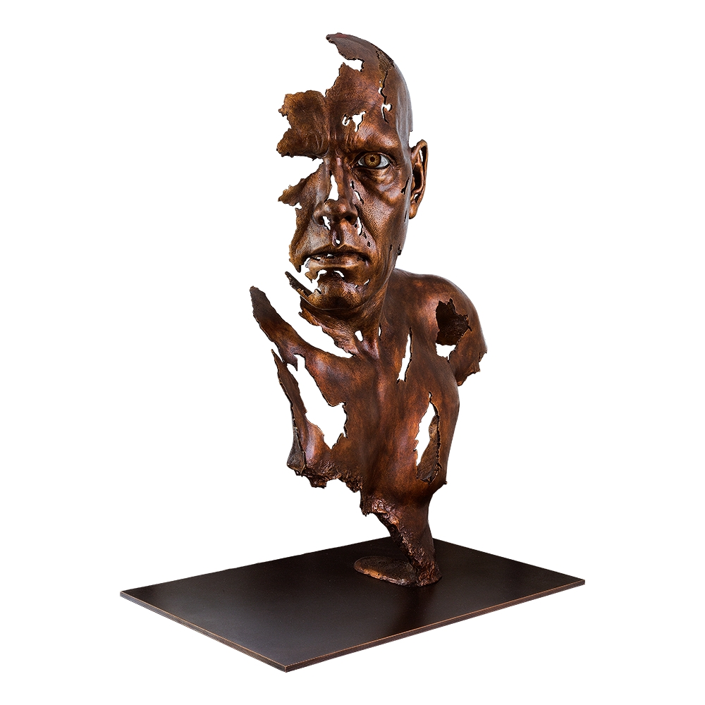 Die Liebe zum Detail und zur anatomischen Genauigkeit sowie zum starken Ausdruck menschlicher Gesichter des Künstlers lässt sich bei dieser Darstellung eines männlichen Kopfes mit starkem Blick aus Bronze, genauer gesagt Jamie Salmons selbst, gut erkennen. Er arbeitet das Gesicht und die Mimik mit all seinen Details und Zügen mit einer beeindruckenden Realistik heraus. Die Falten an Augen und Stirn, Lippen, Nasen und Ohren ja sogar die Poren der Haut sind bei diesem Bronze-Kopf genau zu erkennen und wirken erstaunlich realistisch. Die fragmentierte, zerbrechliche Darstellung bringt die künstlerische Note in diese faszinierende Skulptur. Eine unvergleichliches Kunstwerk für jeden Bronze- und Kunstliebhaber.