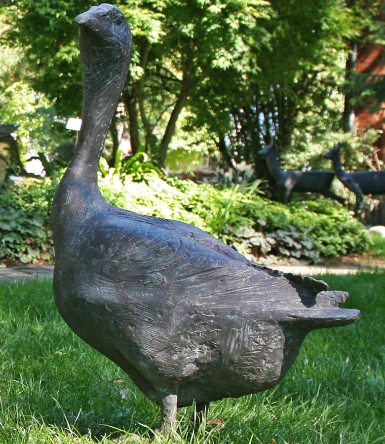 Die kunstvoll gearbeitete Oberfläche mit angedeutetem Gefieder und handgearbeiteter Patina in dunklem Blau-Grau verleiht dieser Bronzeskulptur einen besonderen Charakter. Der schön ausgearbeite Kopf und Hals sowie die kraftvolle Mimik und Haltung der schönen Gans vermittelt die Stärke und gleichzeitigen Anmut dieses Tiers.