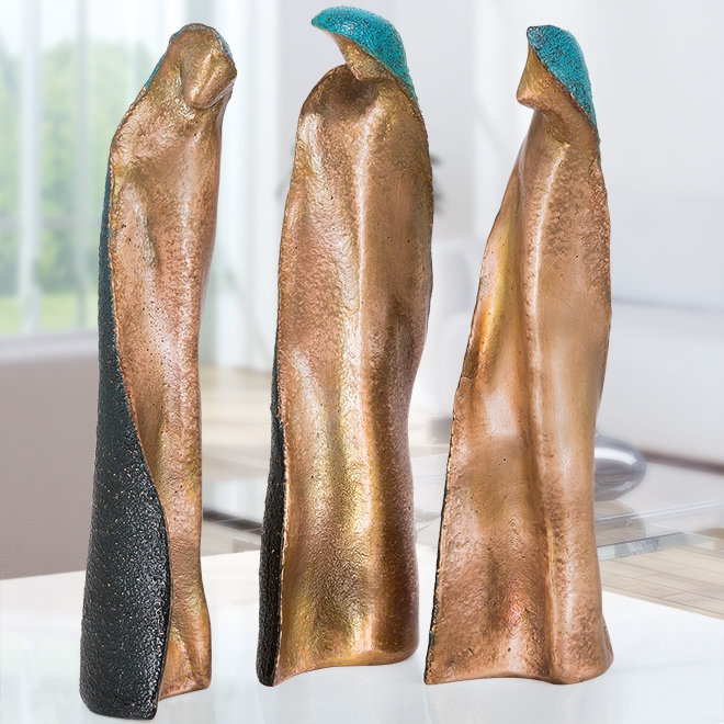 Alle unsere Bronzeskulpturen werden im Wachsausschmelzverfahren in Handarbeit gegossen, veredelt und mit einer feinen Patina überzogen. Diese erhält Ihre Struktur dann durch gekonntes Schleifen und Bürsten.