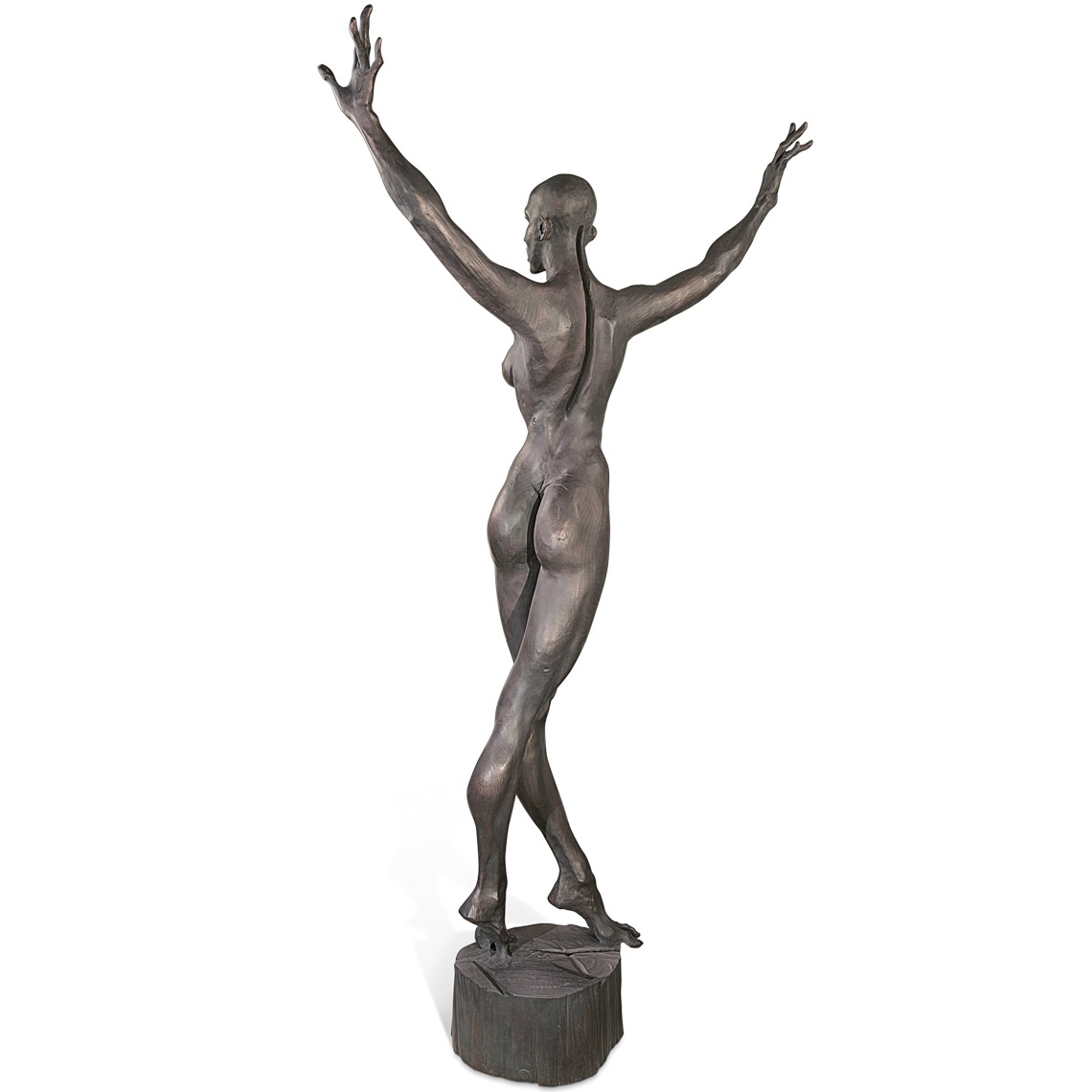 Eine weibliche Gestalt, auf den Zehenspitzen auf einem Holzstumpf balancierend, ja schwebend. Dabei demonstriert sie mit größter Eleganz eine Grundposition des klassischen Balletts.