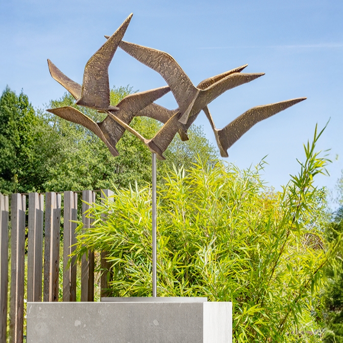 Und zugleich geht es im Motiv des Vogelschwarms um den Aufbruch, um die Suche nach dem Neuen, das ständig und immer wieder zu entdecken ist – im Großen wie im Kleinen, in der Welt überhaupt wie auch, mit unserem bronzenen Schwarm, im heimischen Garten.
