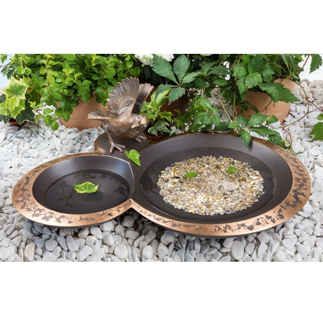 Das gefiederte Gartenpersonal liebt es, sich in Vogeltränken zu baden und zu laben. Bei diesen Exemplaren wartet schon ein Gastgeber und signalisiert: Hier ist es sicher, hier droht keine Gefahr.