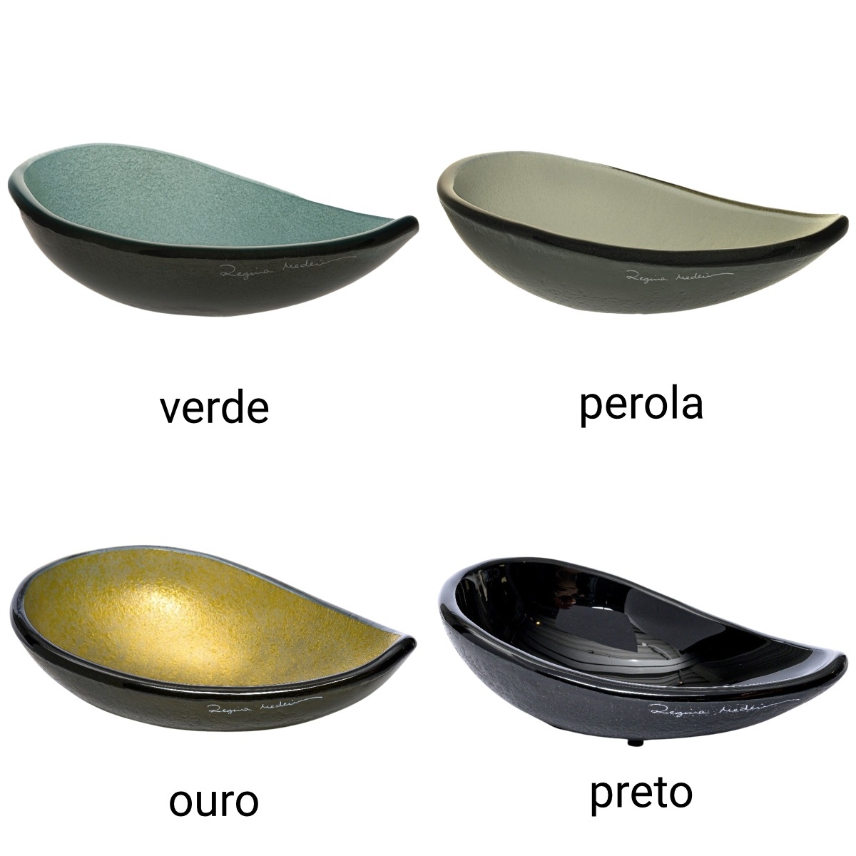 Bowl Ovo – elegante Glasschalen, eingefärbt mit Glimmermineralien und Goldkomponenten. Entworfen von Regina Medeiros, einer brasilianische Glaskünstlerin aus Belo Horizonte. Alle Designs von Regina werden von Hand gefertigt und mit Oxiden und Goldkomponenten eingefärbt.