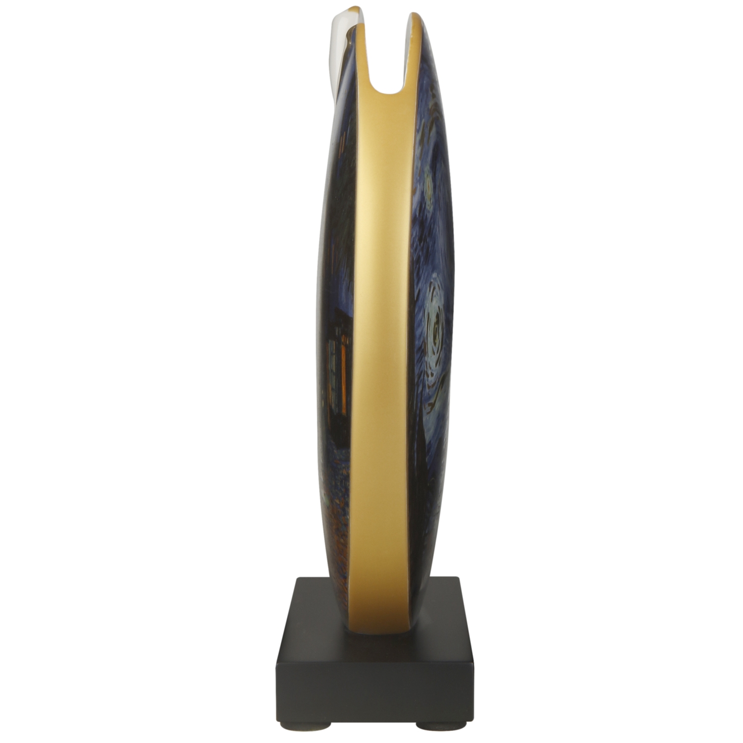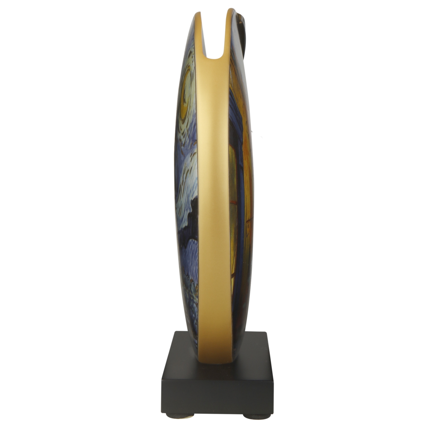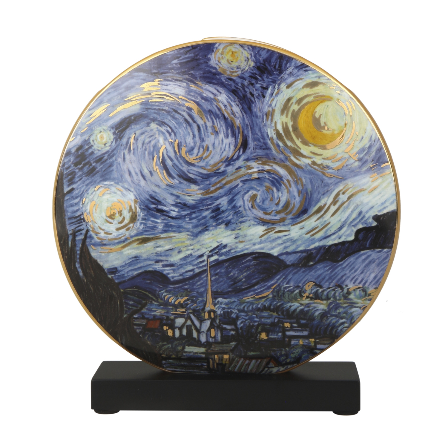 Wie frei schwebend wirkt die dekorative Diskusscheibe aus Porzellan auf dem massiven Holzsockel. Ein Designobjekt, das den berühmten Gemälden von Vincent Van Gogh einen würdigen Auftritt verschafft. Mit und ohne Blumenarrangement ist die Vase ein toller Blickfang für ein stilvolles Zuhause.