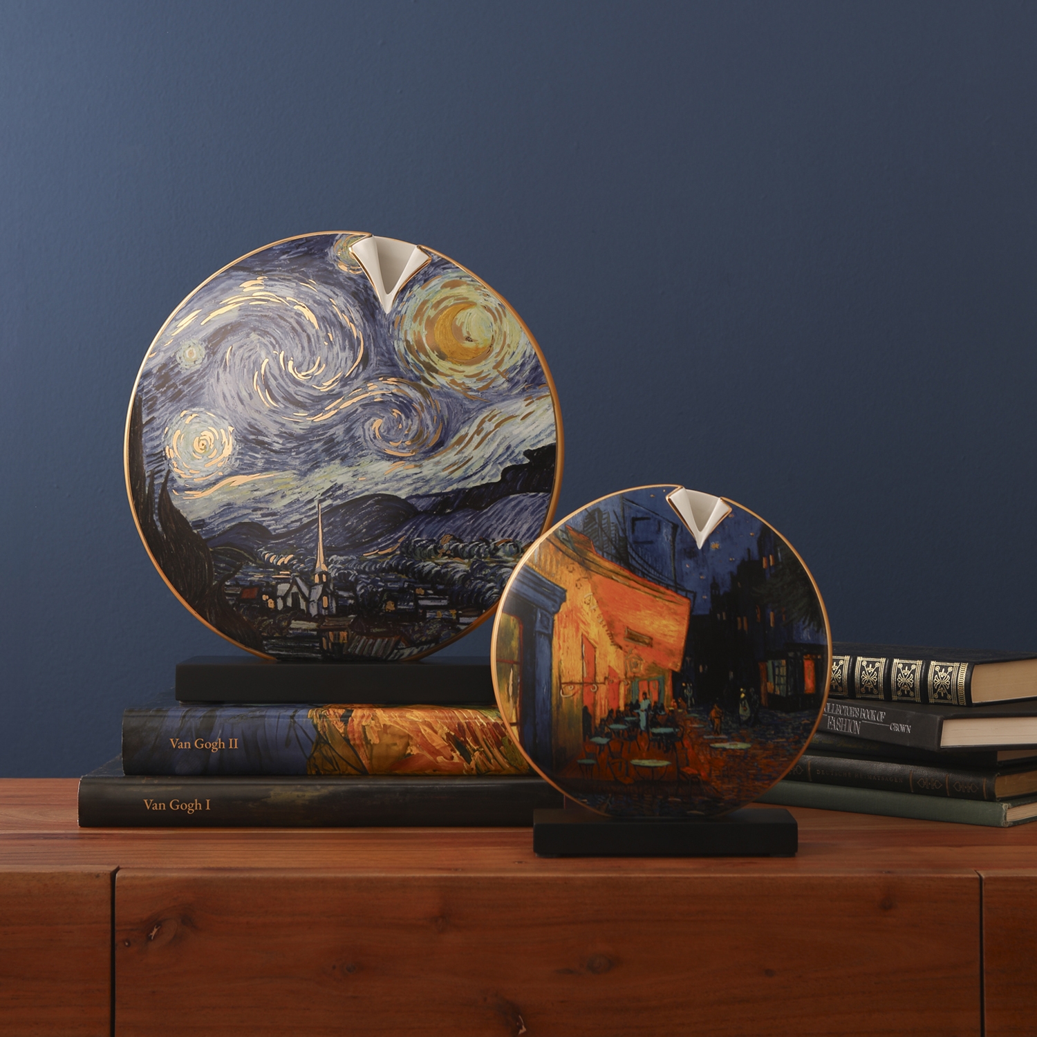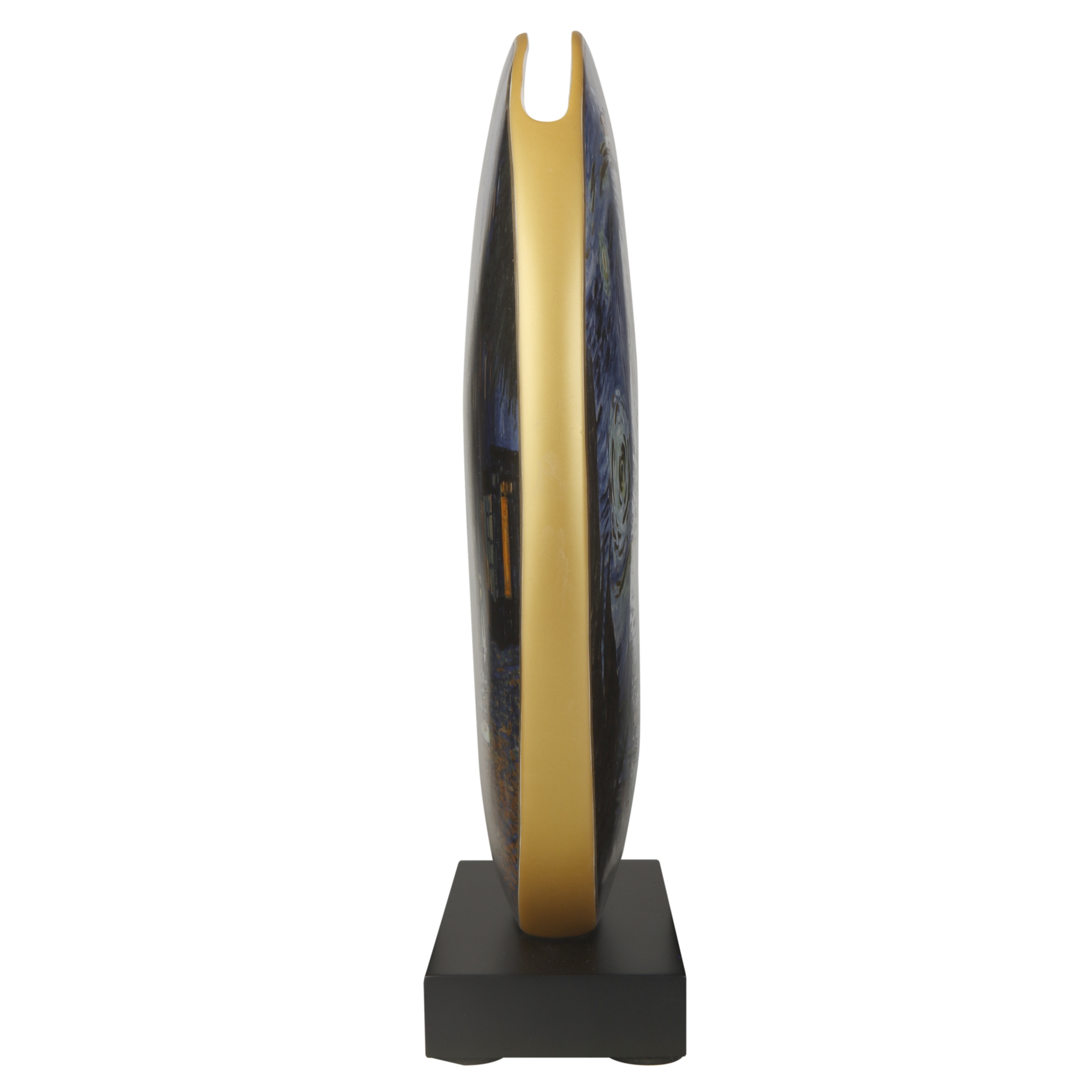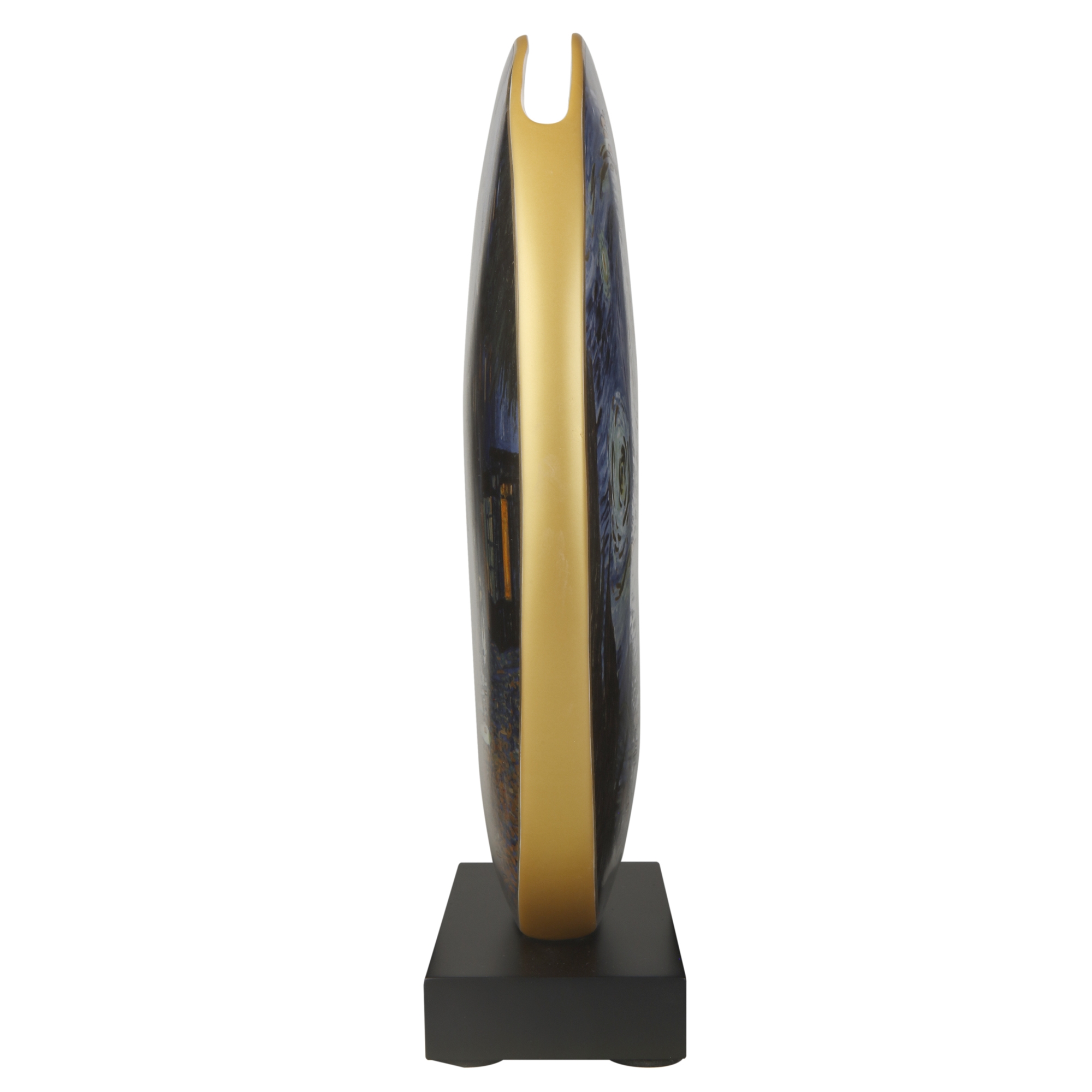Wie frei schwebend wirkt die dekorative Diskusscheibe aus Porzellan auf dem massiven Holzsockel. Ein Designobjekt, das den berühmten Gemälden von Vincent Van Gogh einen würdigen Auftritt verschafft. Mit und ohne Blumenarrangement ist die Vase ein toller Blickfang für ein stilvolles Zuhause.