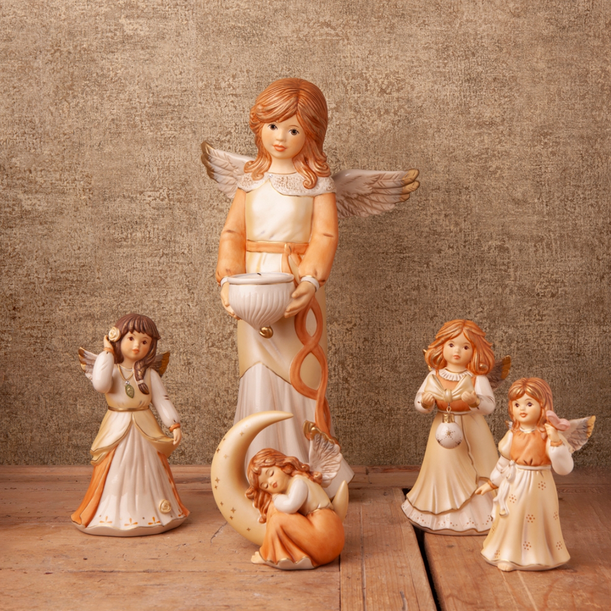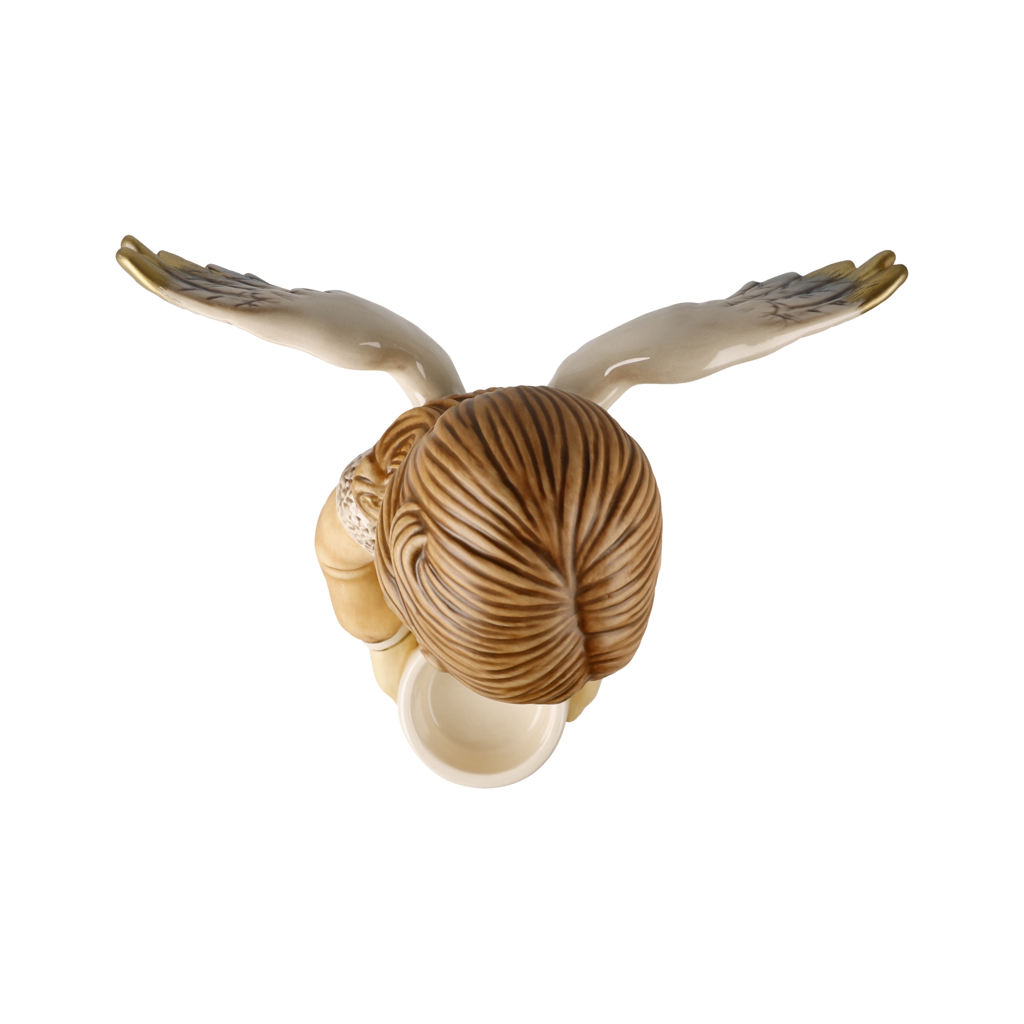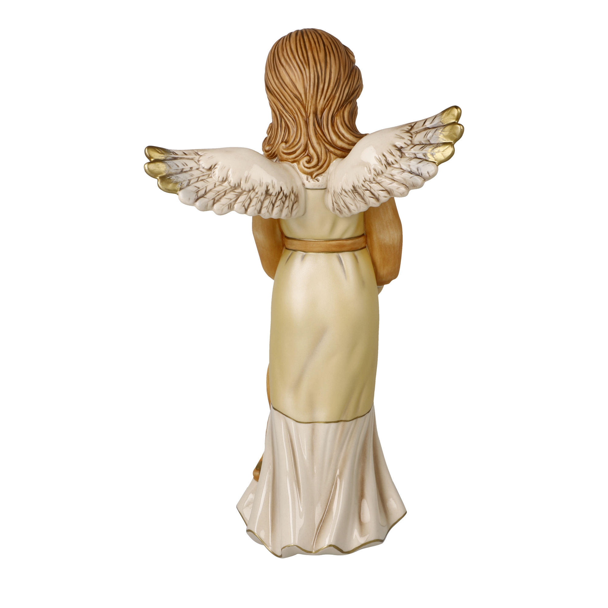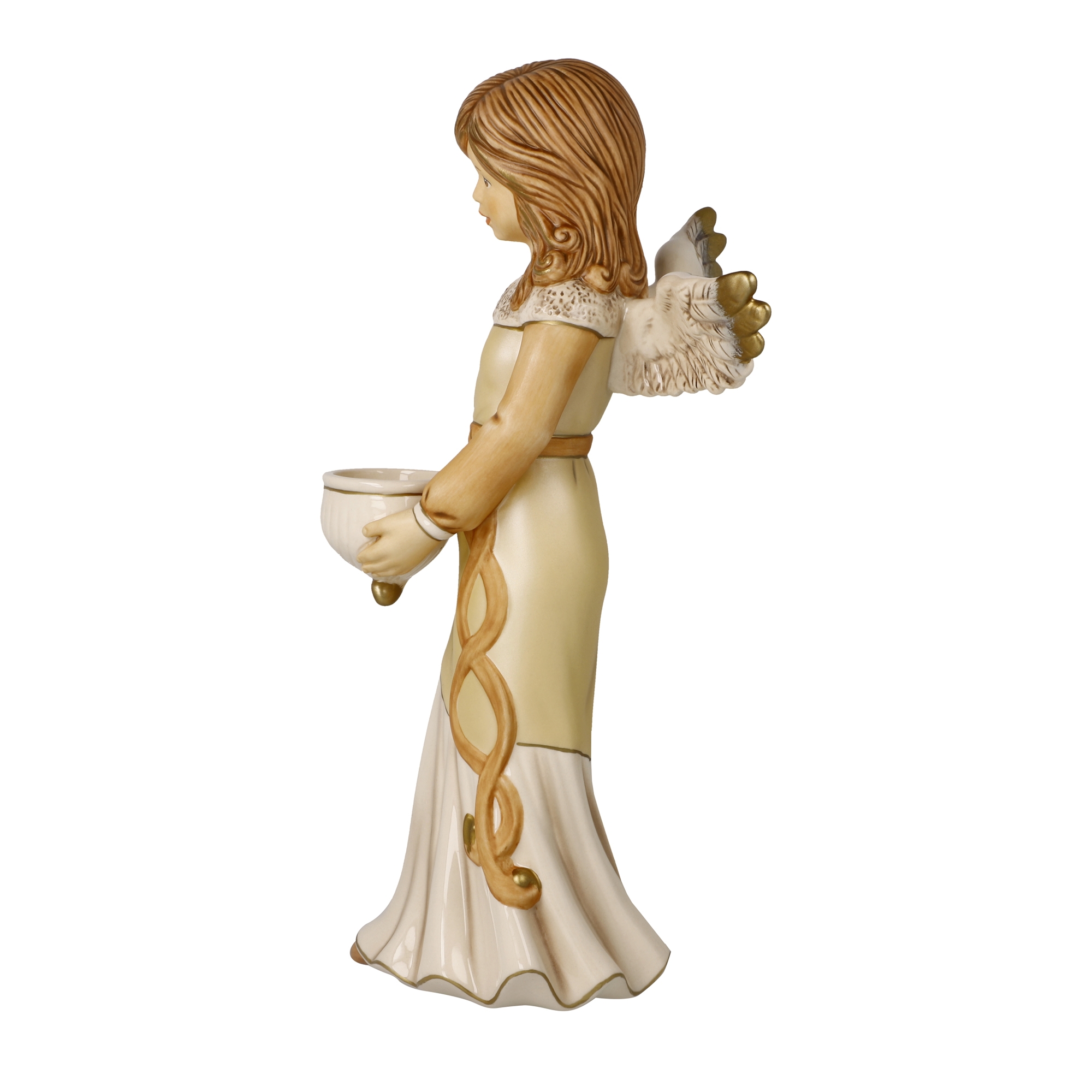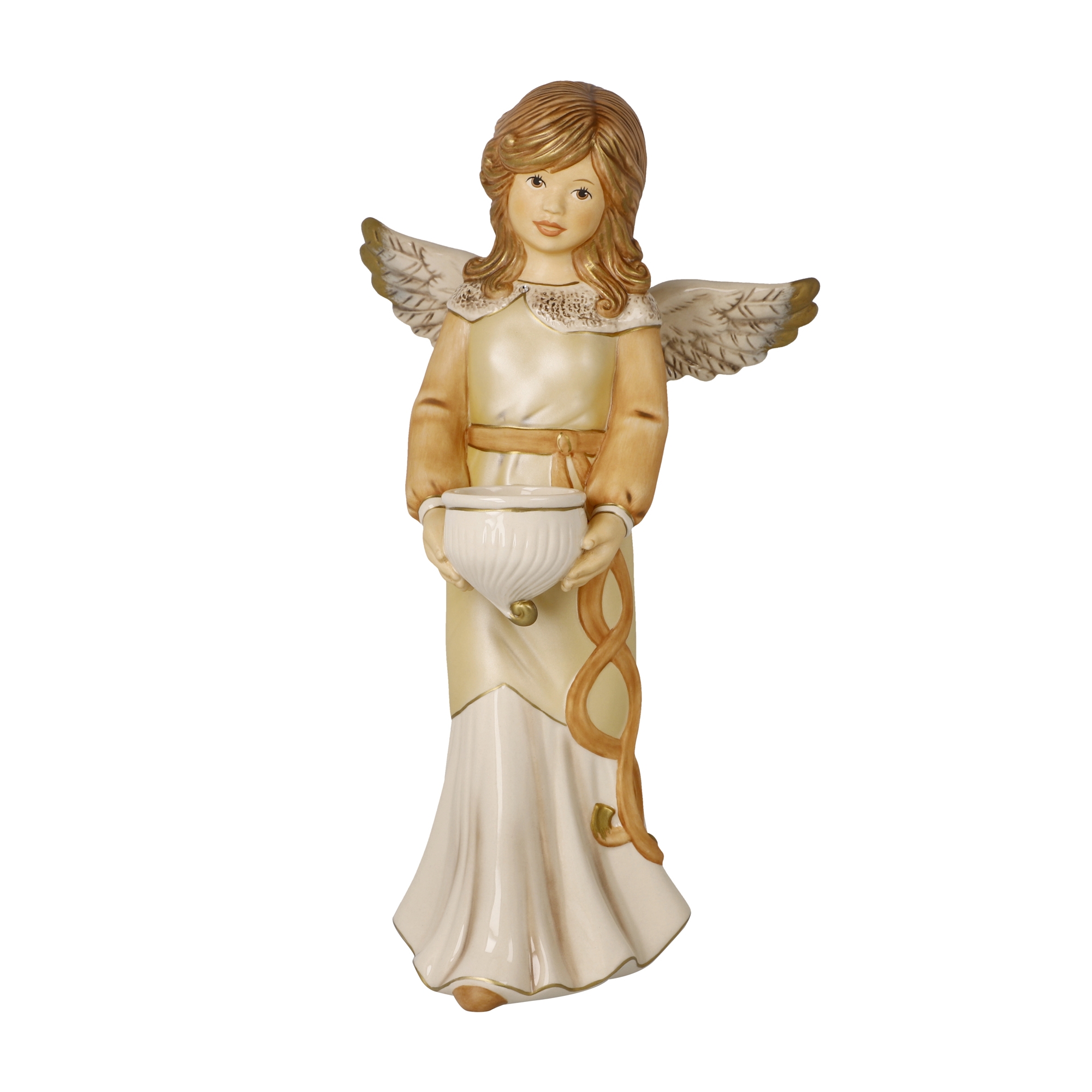 Der himmliche Bote bringt Licht in die gute Stube. Mit einer Größe von 33 cm ist diese Figur die größte unter den diesjährigen Neuheiten und entfaltet damit auch als Einzelfigur eine große Wirkung im Raum. Die Schale in den Händen ist für ein Teelicht hervorragend geeignet.