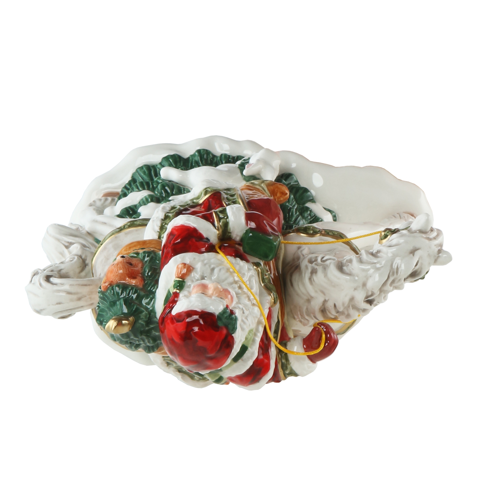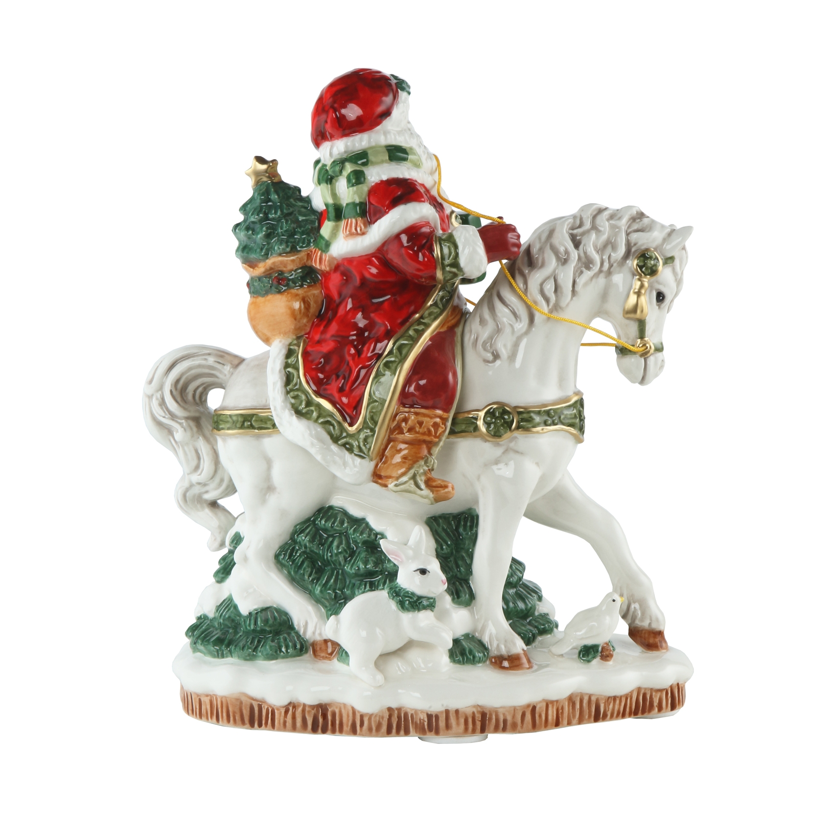 Der Weihnachtsmann kommt auf seinem Schimmel angeritten und verkündet Freude für die Welt. Passend spielt das integrierte aufziehbare Musikwerk die Melodie zu "Joy to the world". Die Figur mit großem Wiedererkennungswert beeindruckt durch ihre detaillierte Formensprache, sowie die aufwändige Unter- und Aufglasurmalerei.