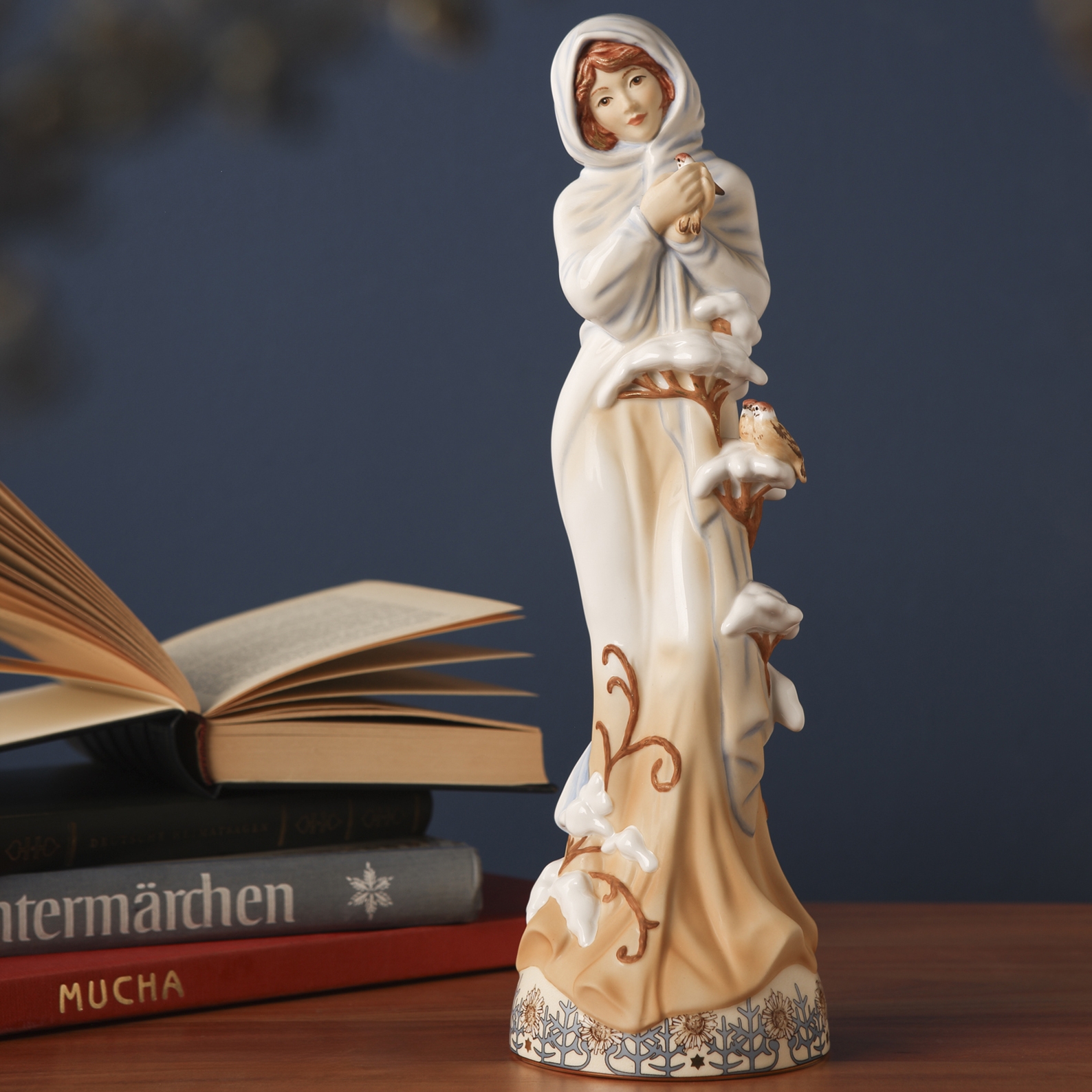 Alphonse Muchas Bilderzyklus "Die vier Jahreszeiten" porträtiert anmutige Frauengestalten umrankt von floralen Bildelementen, die durch Farbgebung und Attribute eine bestimmte Jahreszeit symbolisieren. Als handgefertigte Figurenserie erwachen sie zu neuem Leben! Die Limitierung und die Echtgoldauflage betonen die Wertigkeit der Serie, die 2025 mit der Figur "Winter" komplettiert wird.