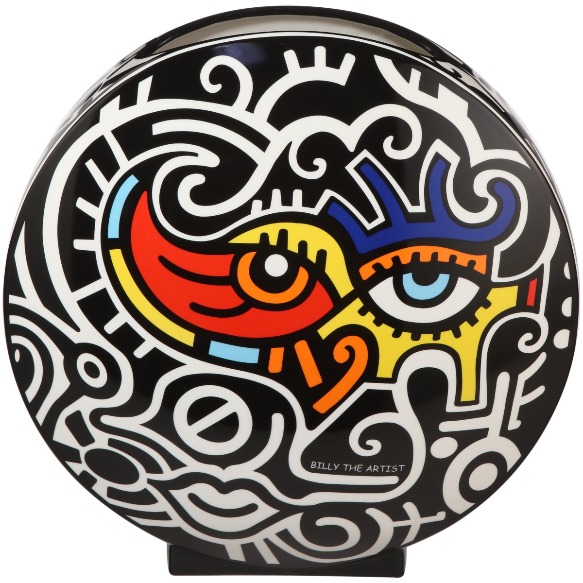 Strahlende Augen – kleine Farbflächen mit Schwarz-Weiß-Kontrast, die wie ein zusammengesetztes Puzzle wirken, ziehen förmlich alle Blicke auf sich und strahlen voll positiver Energie. Man findet die Motive von Billy The Artist auf Vasen, Figuren und auf Accessoires für den täglichen Gebrauch.