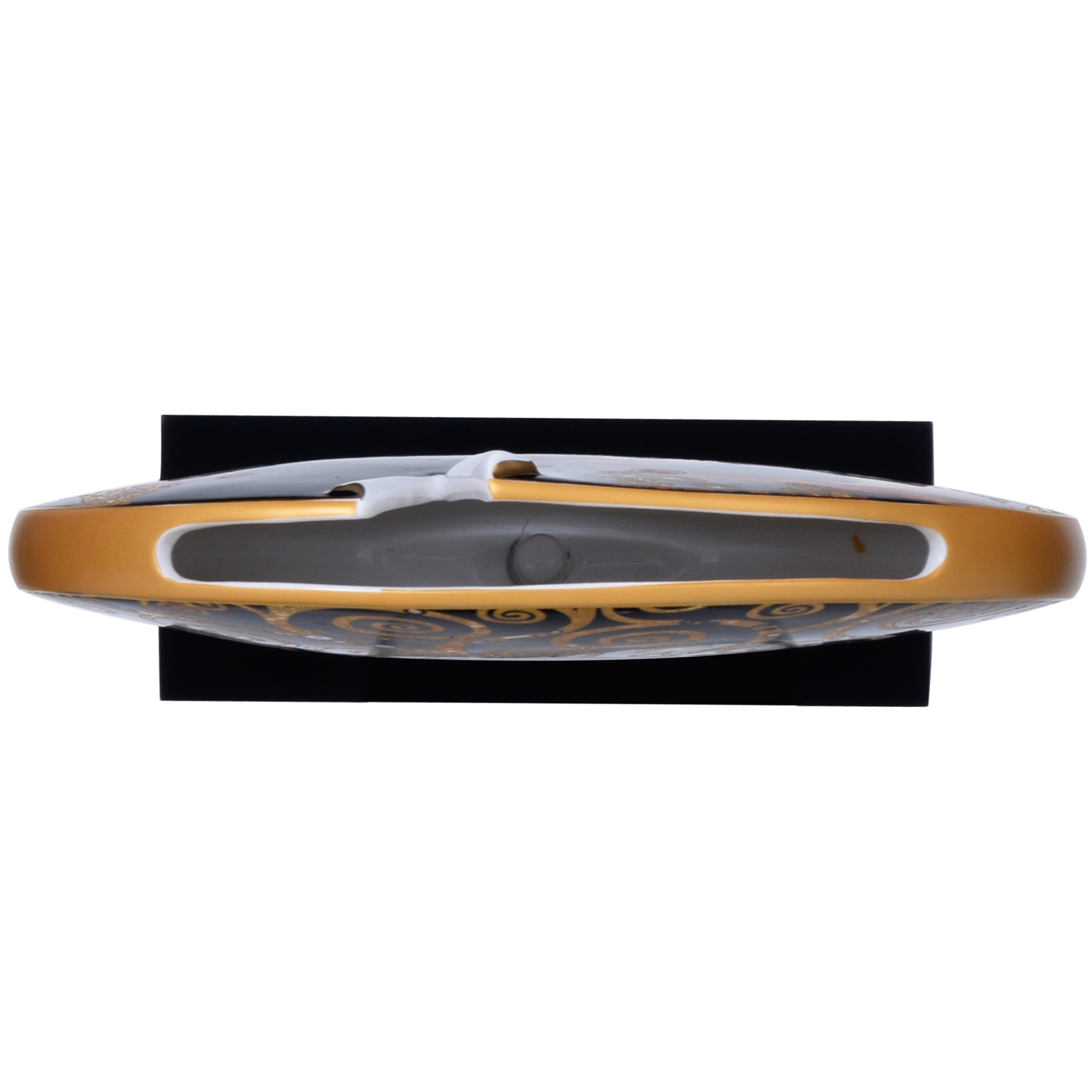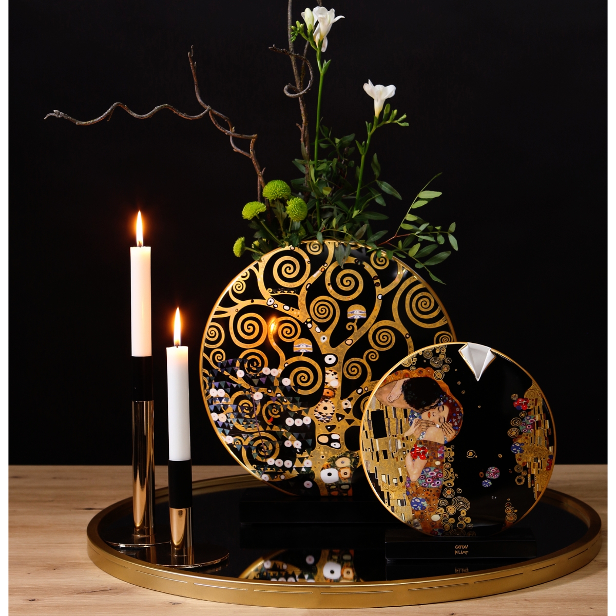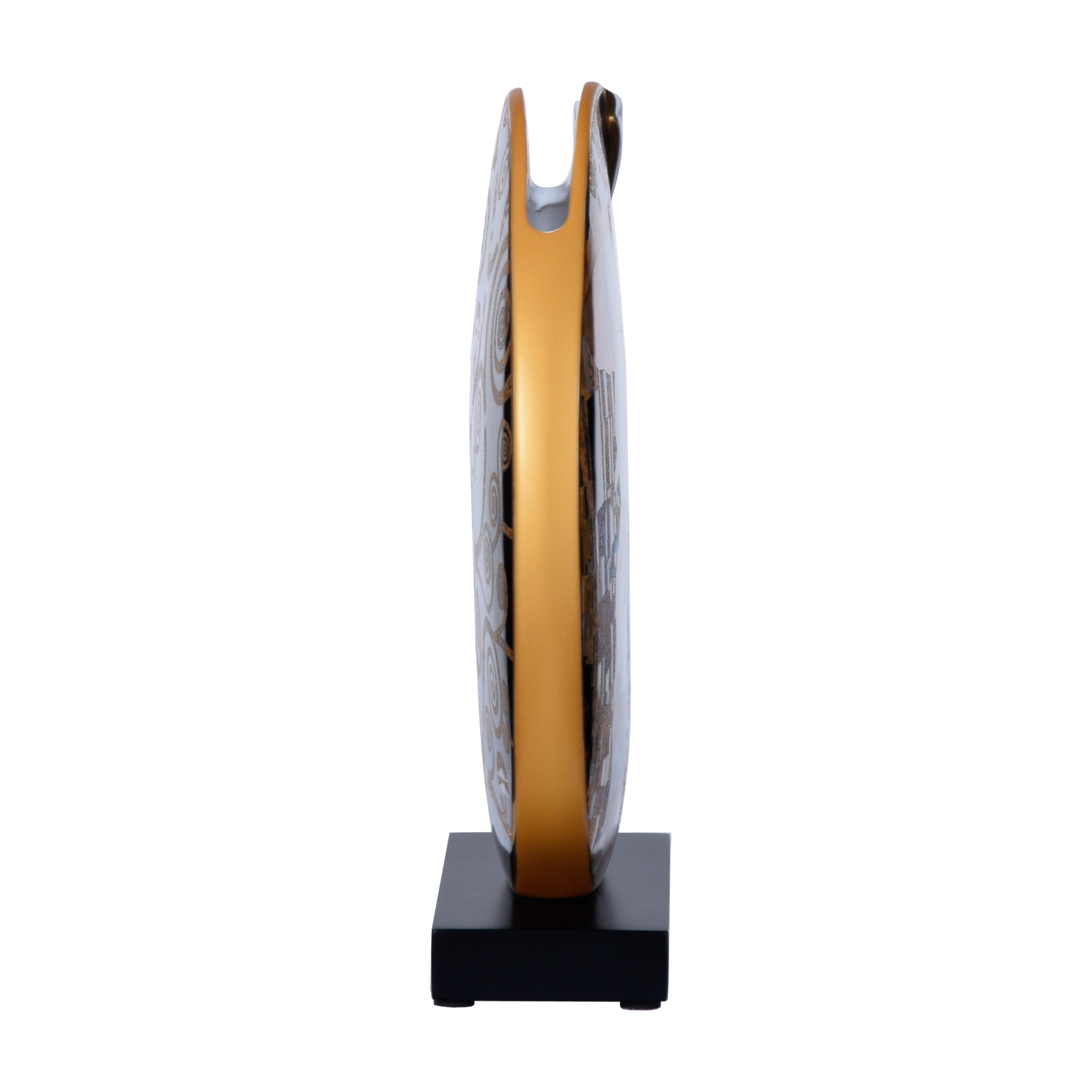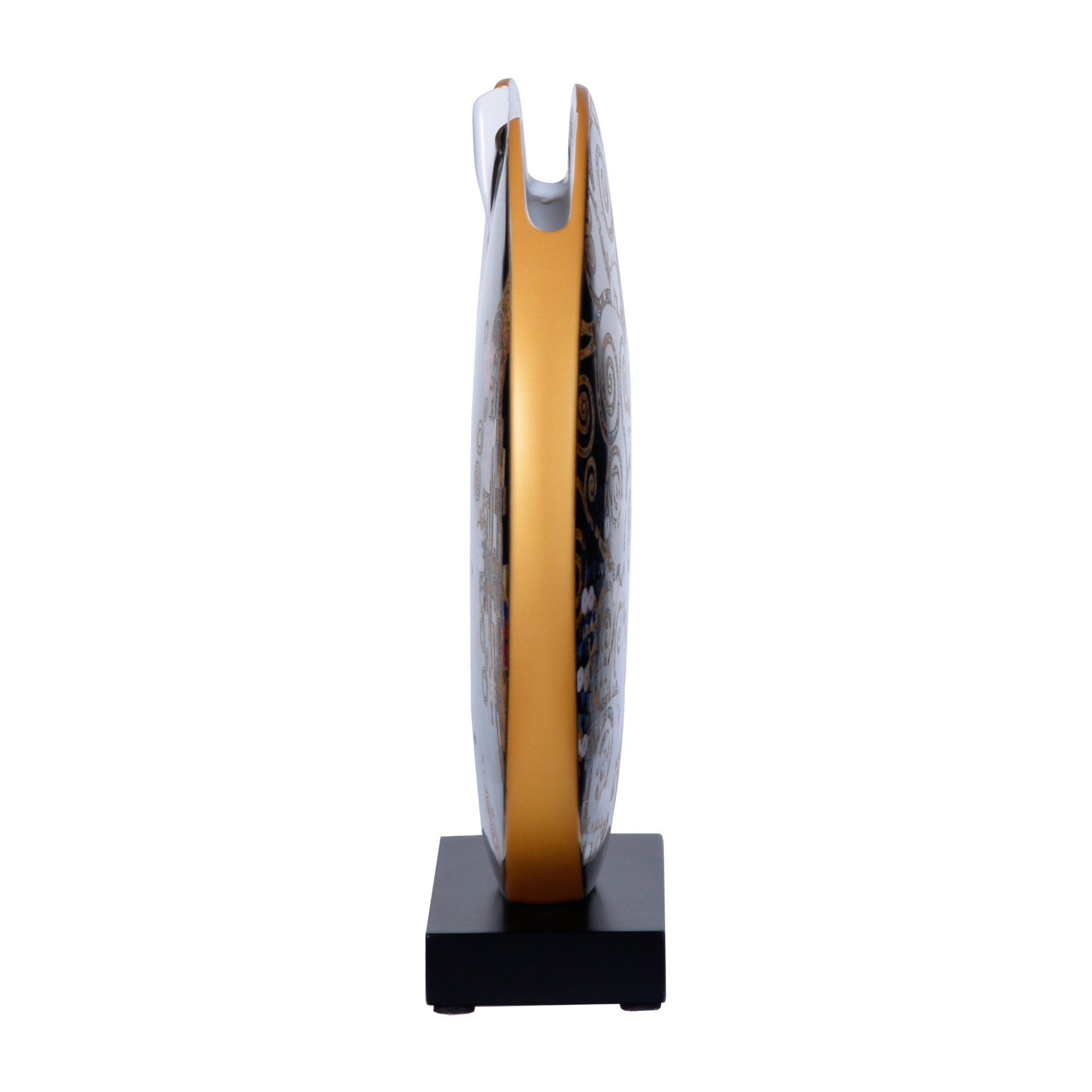 Wie frei schwebend wirkt die dekorative Diskusscheibe aus Porzellan auf dem massiven Holzsockel. Ein Designobjekt, das den berühmten Gemälden von Gustav Klimt einen würdigen Auftritt verschafft. Ob mit oder ohne Blumenarrangement - ein toller Blickfang für ein stilvolles Zuhause.