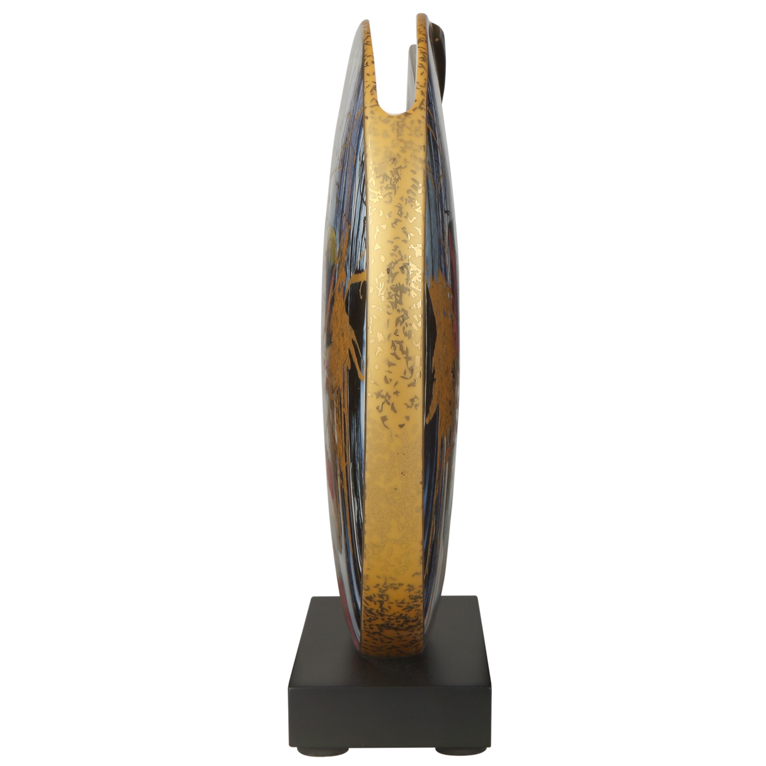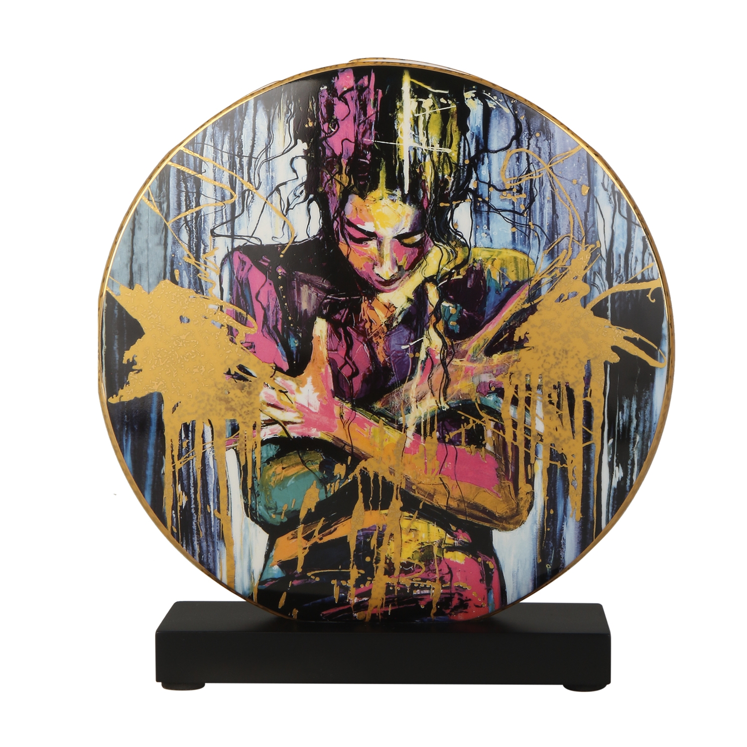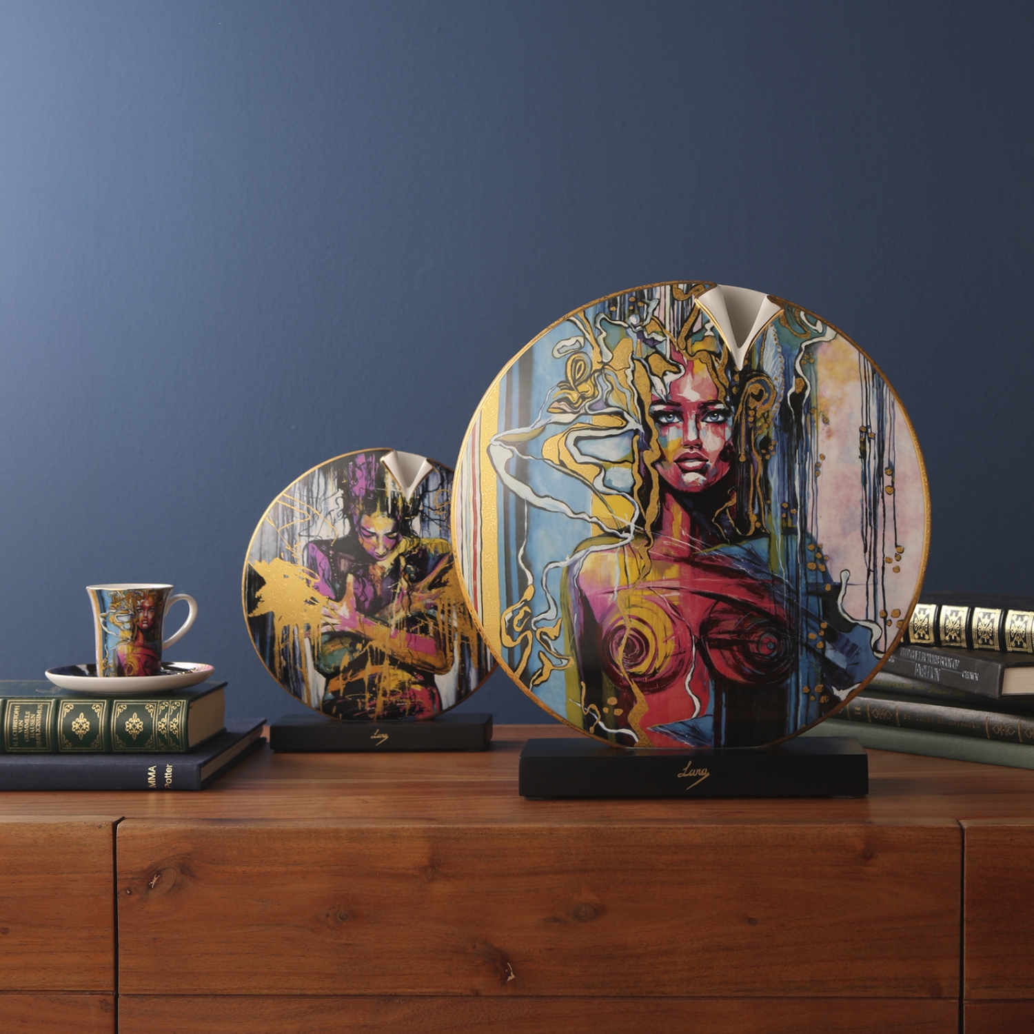 Wie freischwebend wirkt die dekorative Diskusscheibe aus Porzellan auf dem massiven Holzsockel. Ein Designobjekt, das den sinnlichen und kraftvollen Frauendarstellungen von Lana Frey einen würdigen Auftritt verschafft. Ob mit oder ohne Blumenarrangement - ein toller Blickfang für ein stilvolles Zuhause.