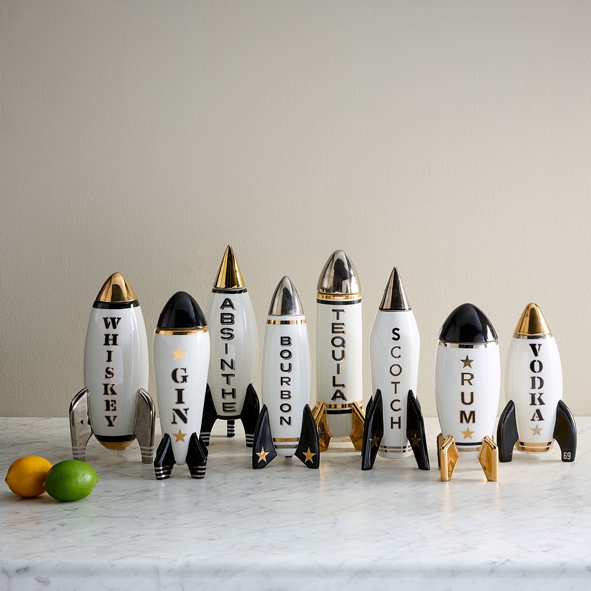 Schicke Spirituosen in den Orbit mit unseren Space-Age-Porzellan-Raketen-Karaffen. Jede ist mit echtem Goldglanz veredelt und mit von der Sowjetära inspirierter Typografie versehen – selbst günstige Spirituosen wirken damit außerirdisch. Dank robuster Dichtungen sind sie ideal für die optimale Aufbewahrung von Spirituosen geeignet. Ein stilbewusster Genießer verdient natürlich auch eine vollständig durchgestylte Bar.