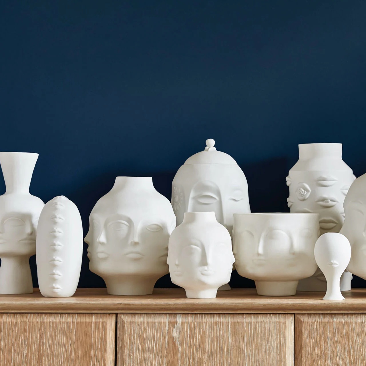 Inspiriert von Dora Maar, der französischen Fotografin, Dichterin und Malerin, die vor allem als Geliebte und Muse von Pablo Picasso bekannt ist. Jonathan formt die Modelle für die Muse-Gefäße und ersetzt anschließend unsere charakteristischen geometrischen Reliefmuster durch Körperteile – Gesichter, Brüste, Lippen – um einen surrealen Stil zu schaffen. Jedes Stück wird aus unglasiertem, mattem Porzellan gefertigt, um die Formen besonders zu betonen, und ist von den Musen unserer Lieblingskünstler inspiriert.