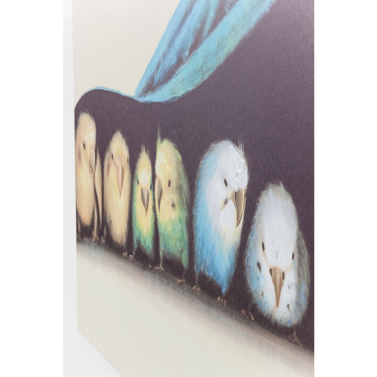 Singvögel geschützt unter der Decke mit dem Hund. Der bunte Vogelschwarm ist an Farbenfreude kaum zu übertreffen. Die vielen Details sind handgemalt und machen jedes Bild zu einem Unikat.