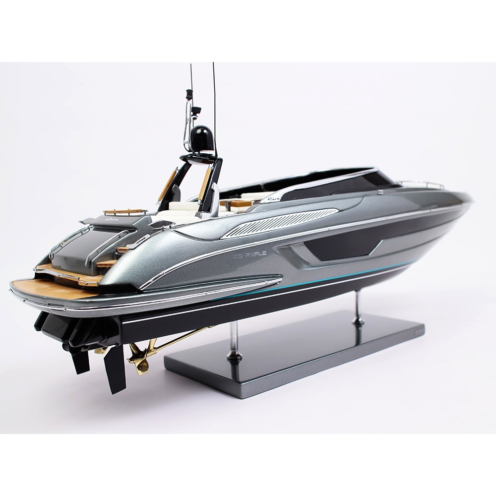 Dieses exklusive offizielle Modell von RIVA RIVALE ist 59 cm lang und wurde im Maßstab 1:30 hergestellt. Die originalgetreue Nachbildung der neuesten Riva-Serie ist vollständig handgefertigt. Der Rumpf wurde nach den ursprünglichen Plänen in Glasfaser und Polyester gefertigt. Alle Beschläge bestehen aus verchromtem Messing, das von Juwelieren maßgefertigt wurde. Eine echte Marinepolsterung wird zum Herstellen von Sitzen und zum Sonnenbaden verwendet. Auf das Deck werden 10 Lackschichten aufgetragen, um einen hervorragenden Glanz und eine hervorragende Lacktiefe zu erzielen. Auf den Rumpf wird eine metallische Metallicfarbe "Blue Sera" aufgetragen. Das Modell wird in einer doppelt gesicherten Verpackung mit nummeriertem Echtheitszertifikat und einem Jahr Garantie geliefert.