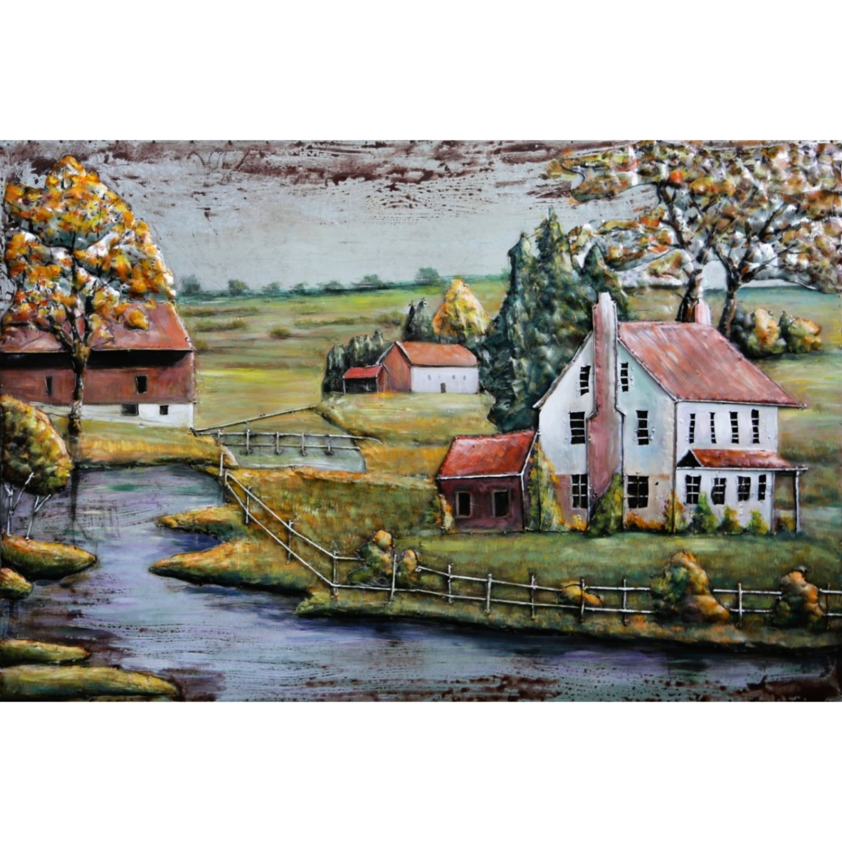 Traumhaftes Landschaftsbild mit detaillierten Bäumen im Hintergrund und einer kleinen Brücke die sich quer durch das Bild schlängelt. Bereichern Sie Ihren Wohnraum mit diesem idyllischen Metall - Wandbild "Bauernhof", klein.