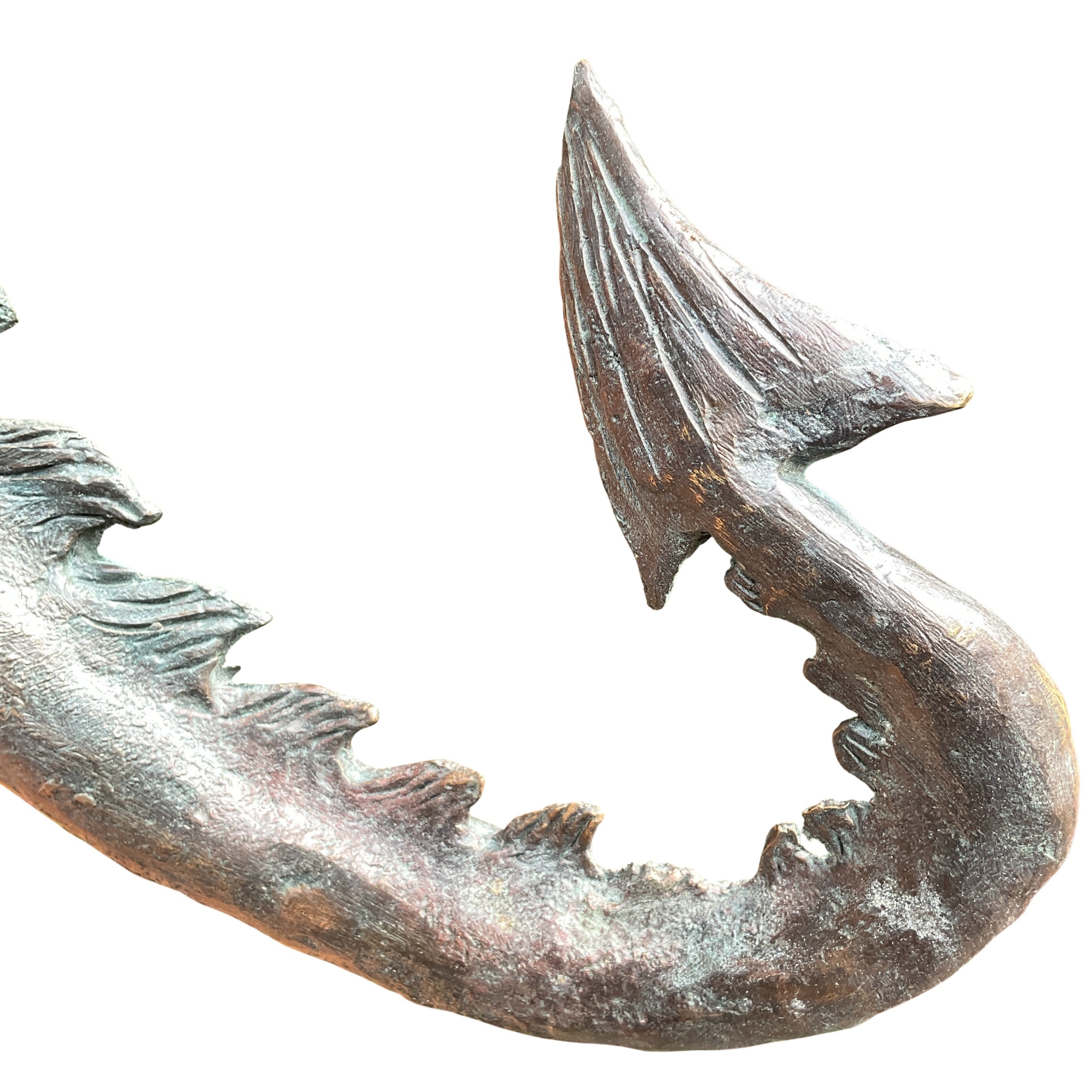 Detaillierter und großer Bronze-Drache in feiner Handarbeit hergestellt. Die Skulptur wurde im Wachsausschmelzverfahren nach alter Tradition von Hand ausgeformt, in Bronze gegossen, weiter bearbeitet und zum Schluss mit einer feinen Patina versehen.