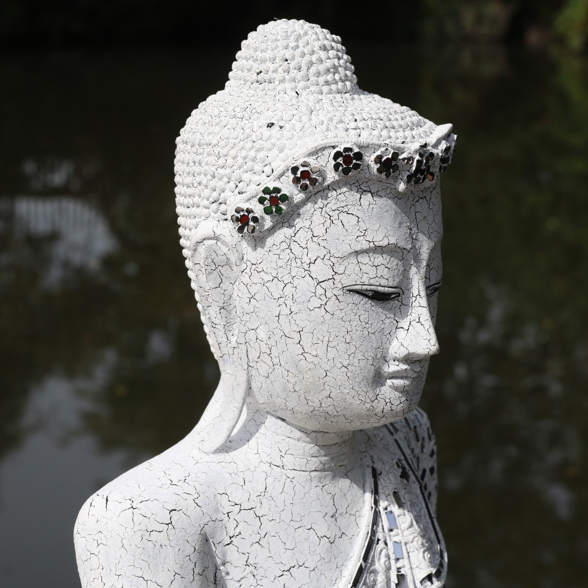 Unsere Buddhaskulpturen werden alle von Hand aus einem Stück massivem Holz in Thailand geschnitzt und anschließend aufwendig koloriert und verziert. Jede Skulptur ist daher ein Unikat und kleinere Abweichungen in Form, Größe, Farbe und Verzierung sind unvermeidbar. Goldene Buddhas oder goldfarbene Details sind Blattvergoldet und nicht lackiert.