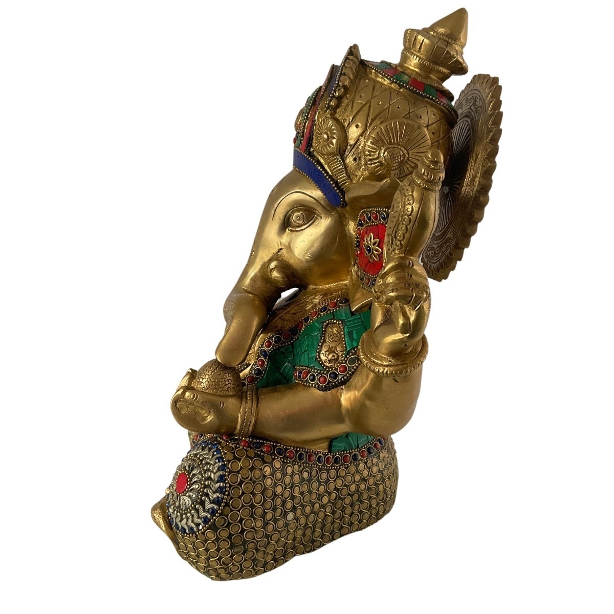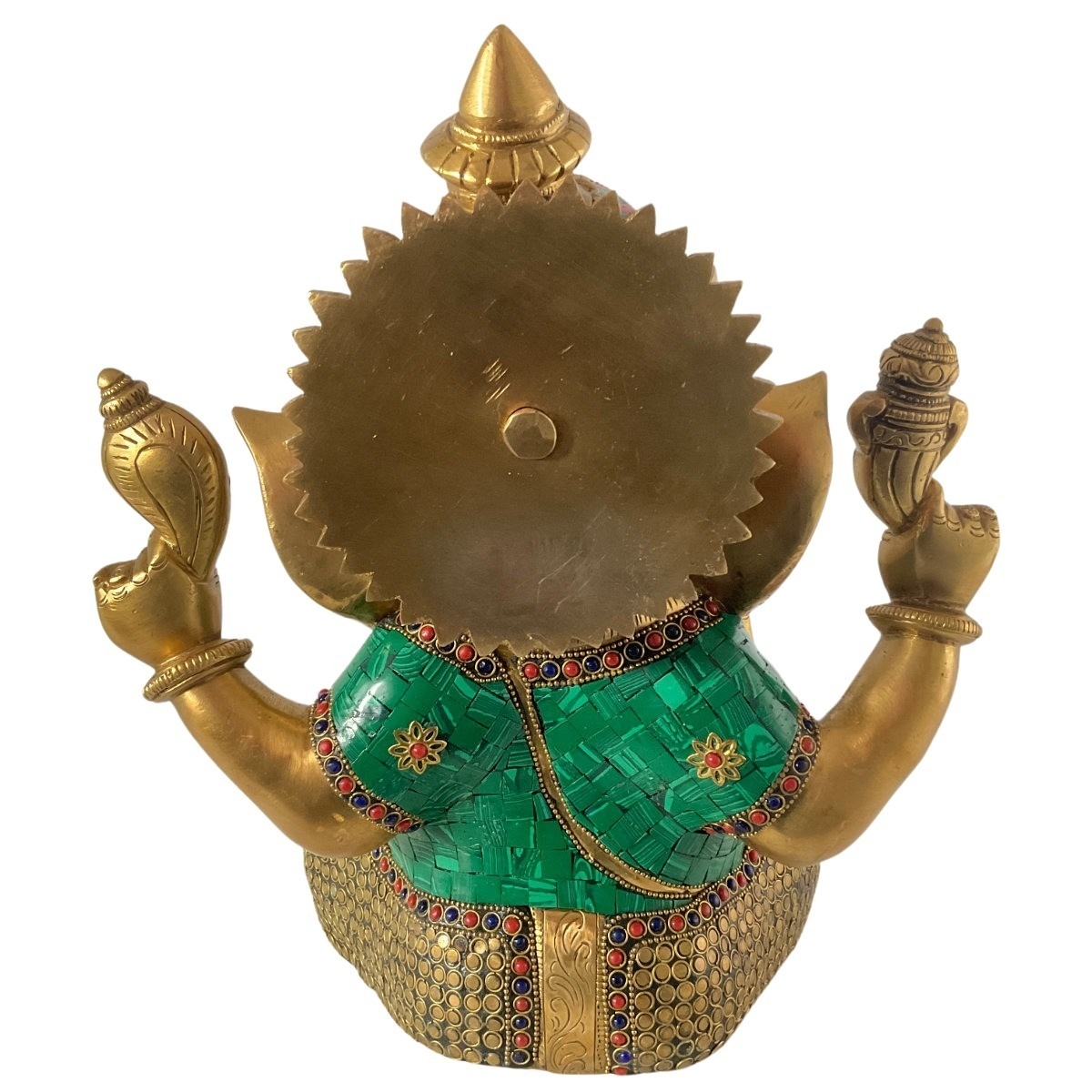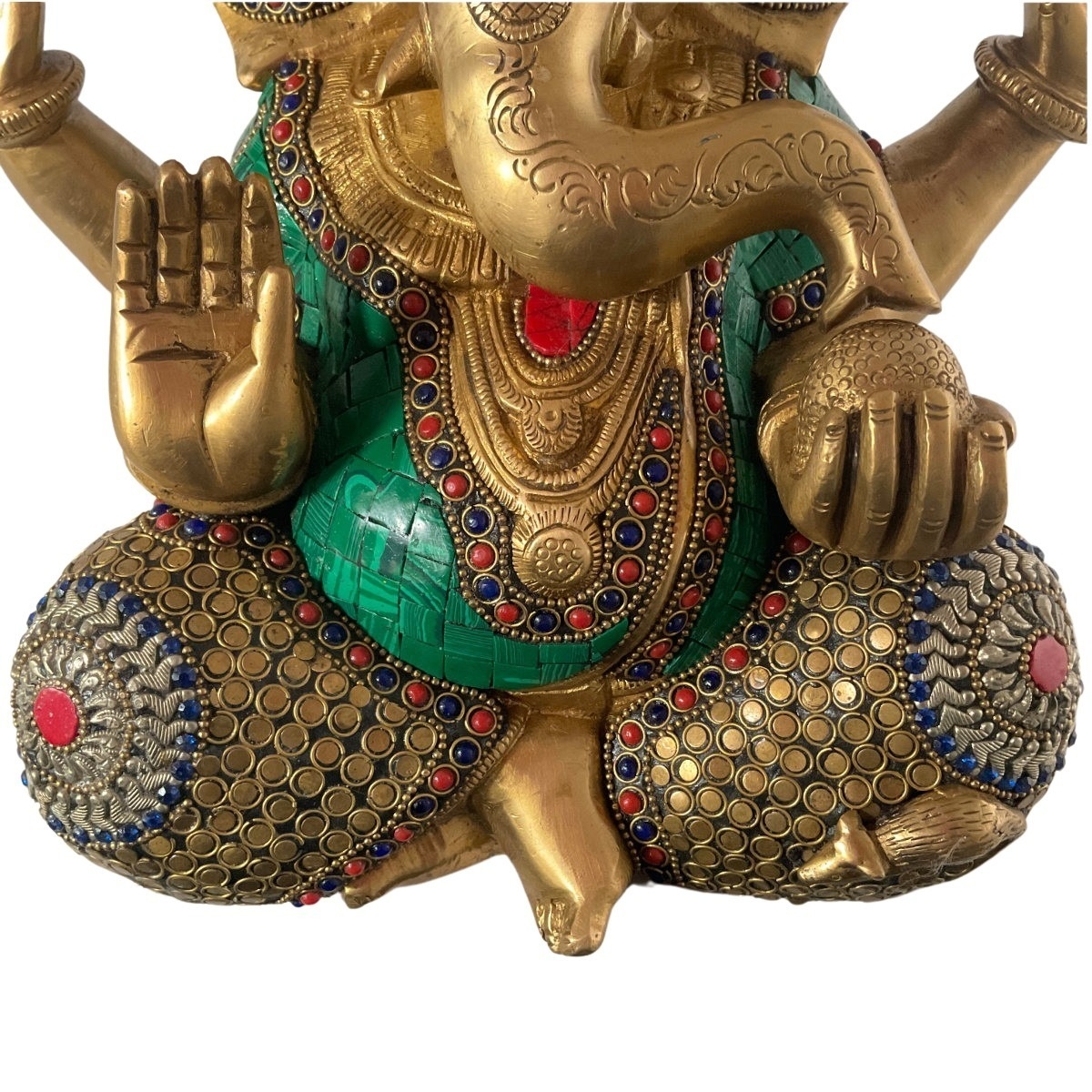 Ganesha hat vier Arme. Sie repräsentieren die vier Aspekte des feinstofflichen Körpers: Verstand, Ego, Geist und Bewusstsein. Die Skulptur wurde mit einer goldenen Patina versehen. Das Gewand ziert eine Vielzahl von Edelsteinen.
