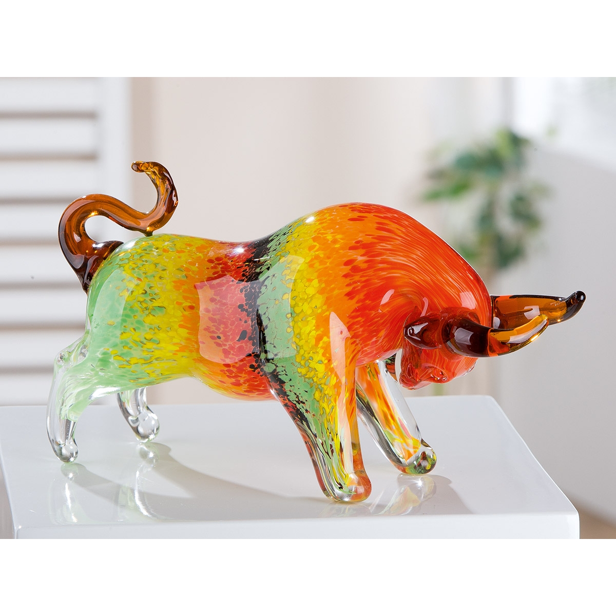 Die Glasskulptur „Bunter Stier“ ist ein beeindruckendes Kunstobjekt, das Kraft, Eleganz und Dynamik auf besondere Weise vereint. Handgefertigt aus hochwertigem Glas, besticht sie durch ihre intensiven Farbtöne, die im Licht einen warmgoldenen Schimmer entfalten. Die geschwungene, lebendige Form bringt die Vitalität und Stärke des Stiers eindrucksvoll zur Geltung.