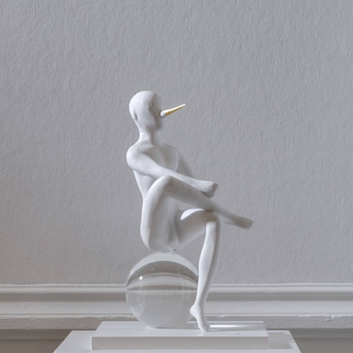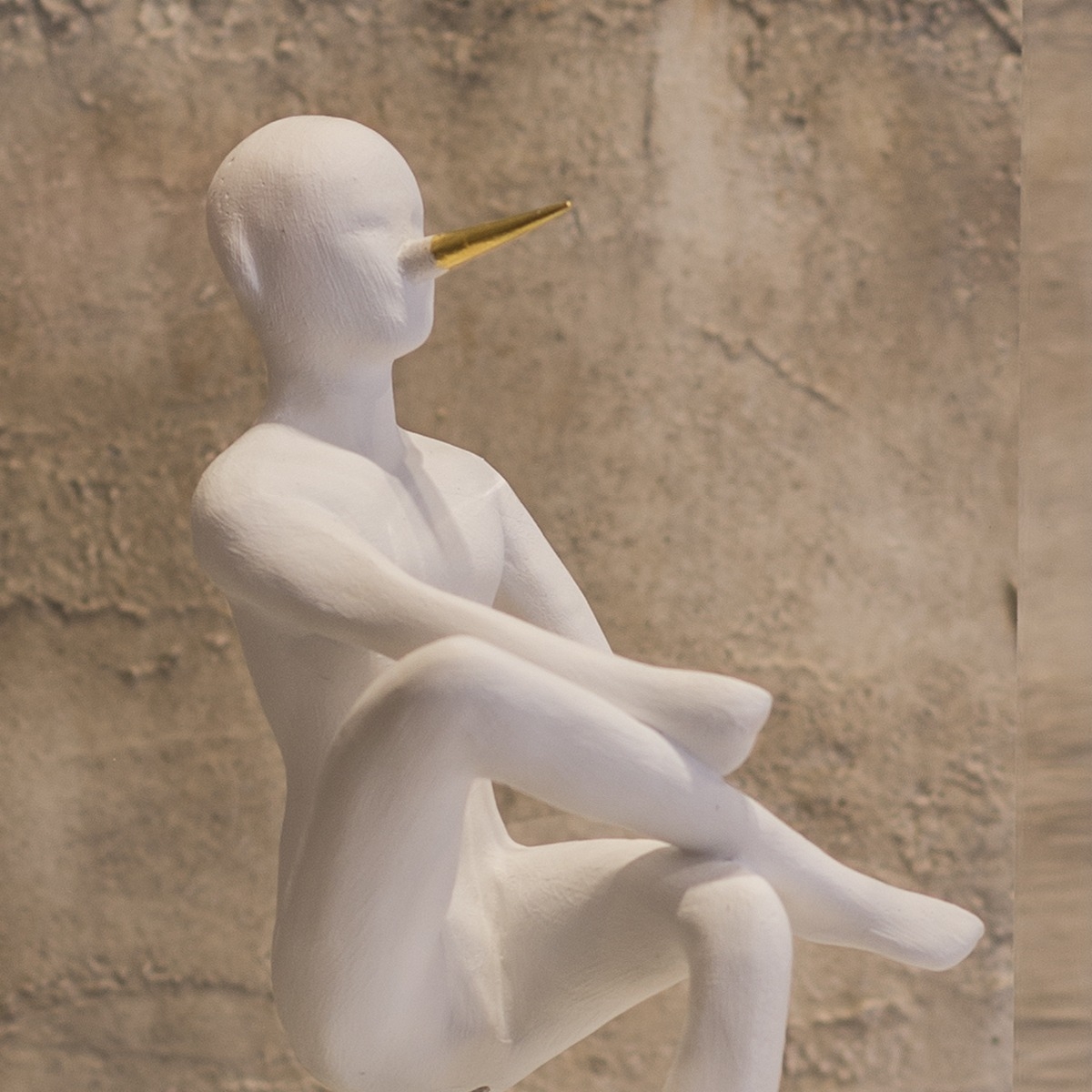 Pinocchio ist Teil einer Serie von Keramikfiguren, die verschiedene Aspekte der menschlichen Natur widerspiegeln. Die Serie zeigt uns, wie Menschen versuchen, ihre Verletzlichkeit zu verbergen, indem sie sich auf eine bestimmte Weise verhalten. Pinocchio, der auf einer durchsichtigen Blase sitzt und die Nase in die Luft streckt, stellt jemanden dar, der in seiner eigenen Welt lebt und Fiktion und Realität nicht unterscheiden kann. Ein Gehäuse aus Plexiglas unterstreicht die Distanzierung der Figur von der Welt.
