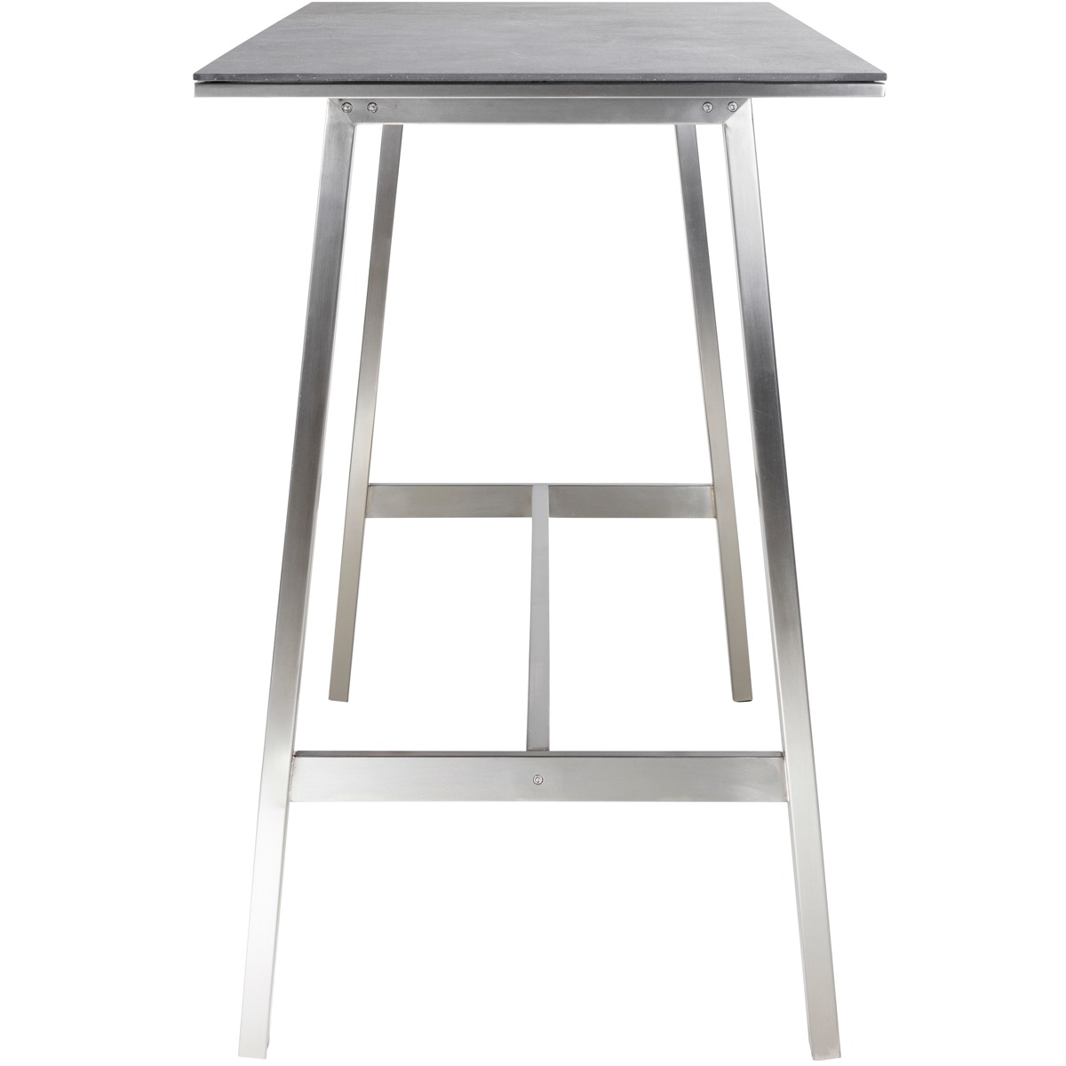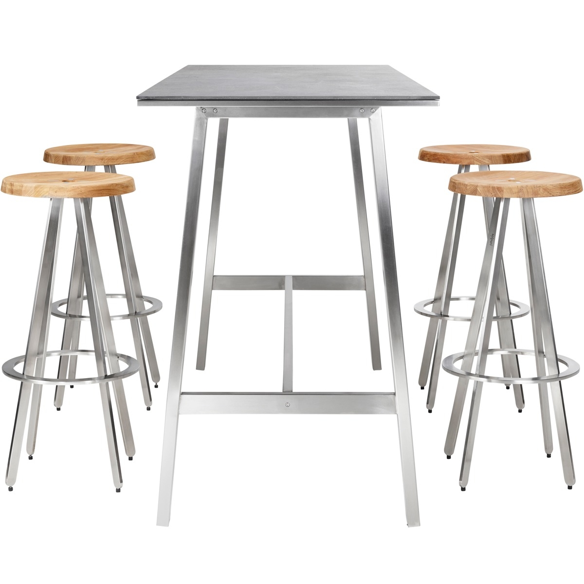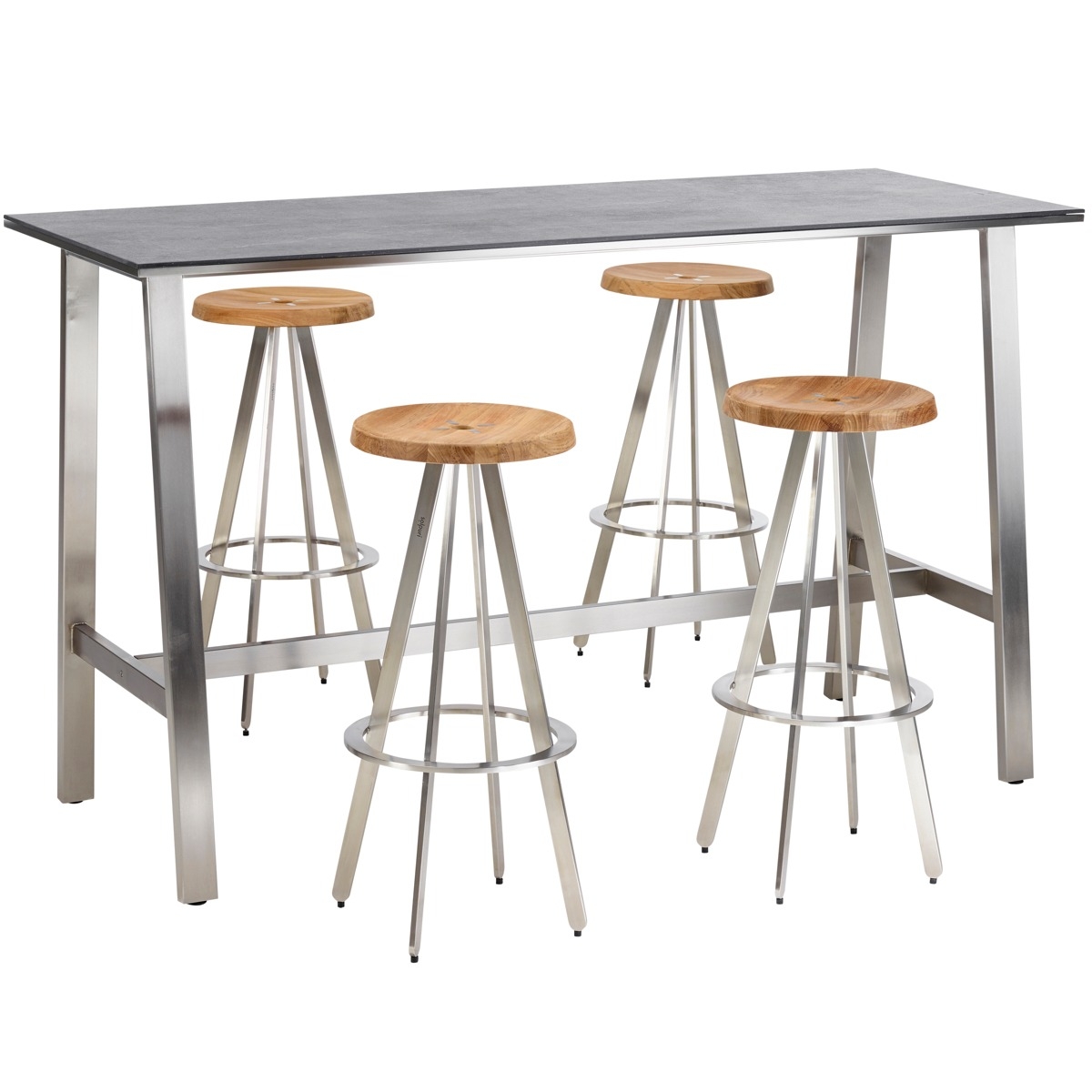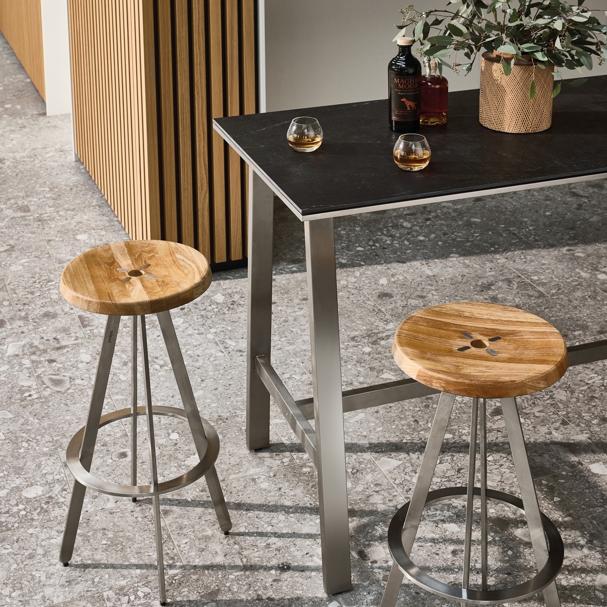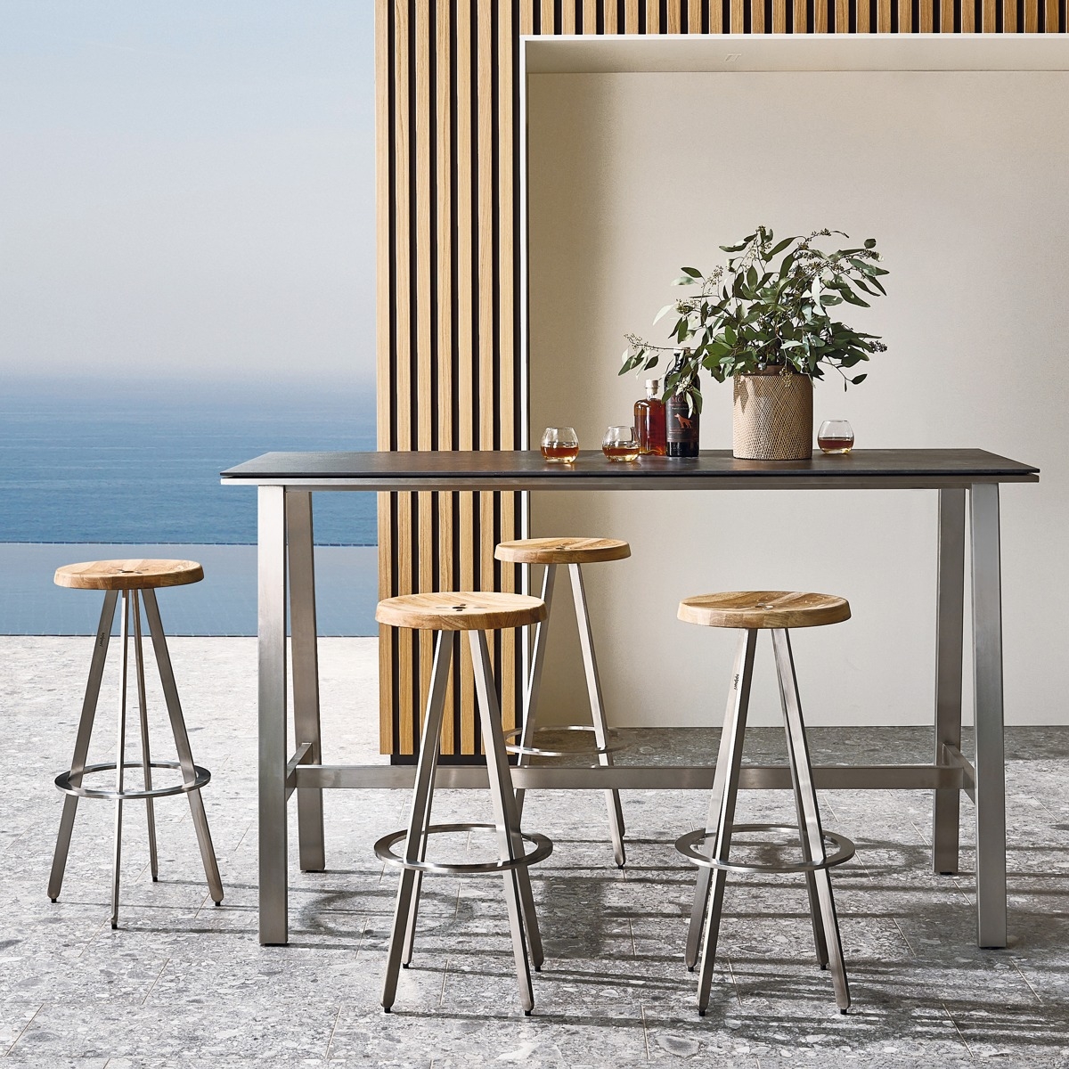 Zur Auswahl stehen verschiedene, wetterfeste Tischplatten aus HPL ("High pressure laminate"), Keramik oder Dekton (hochverdichtete Keramik + Porzellan Mischung). Das silber glänzende Gestell des Bartischs erzeugt in Kombination mit einer der individuell wählbaren Tischplatten ein optisch ansprechendes Möbel mit stilvoller Eleganz.