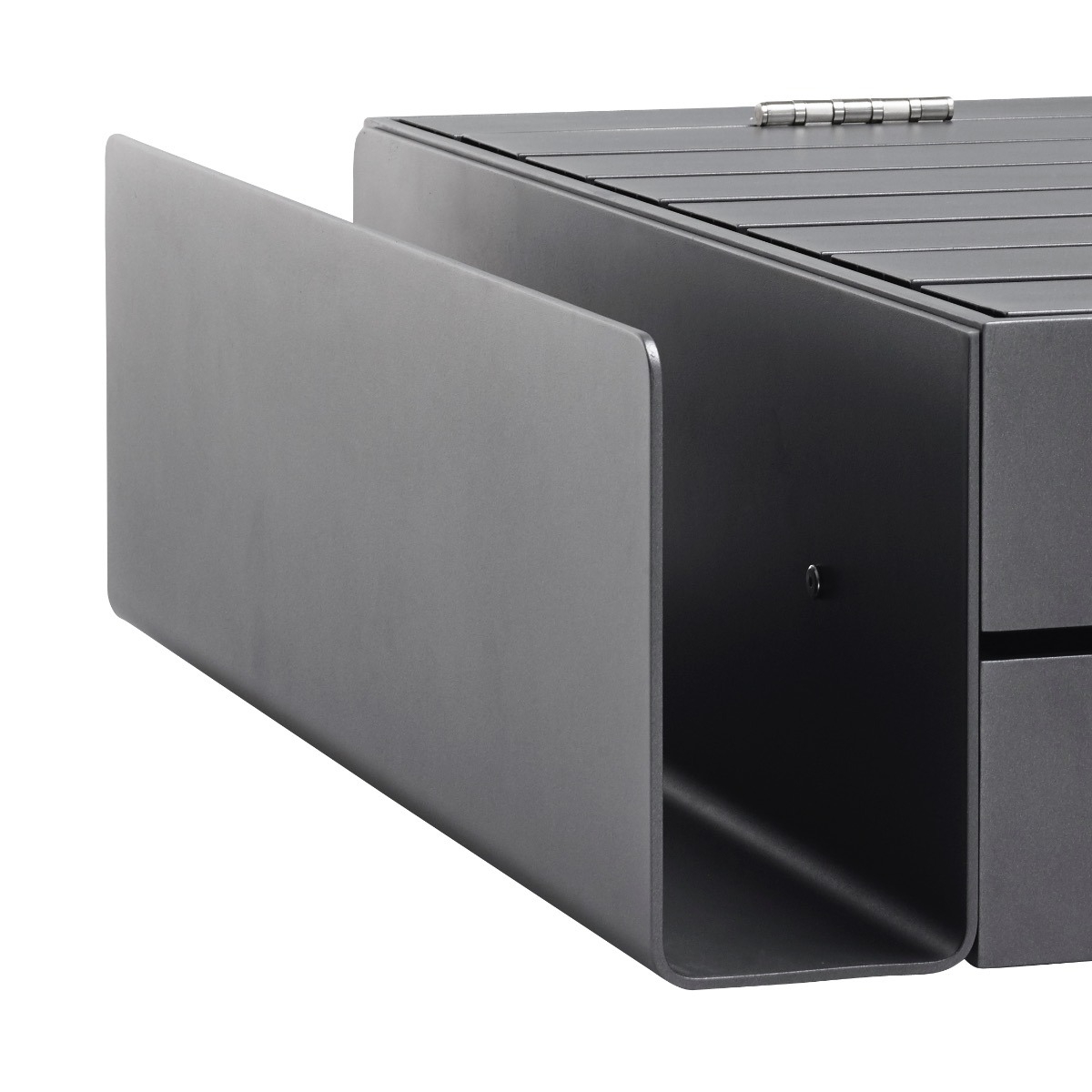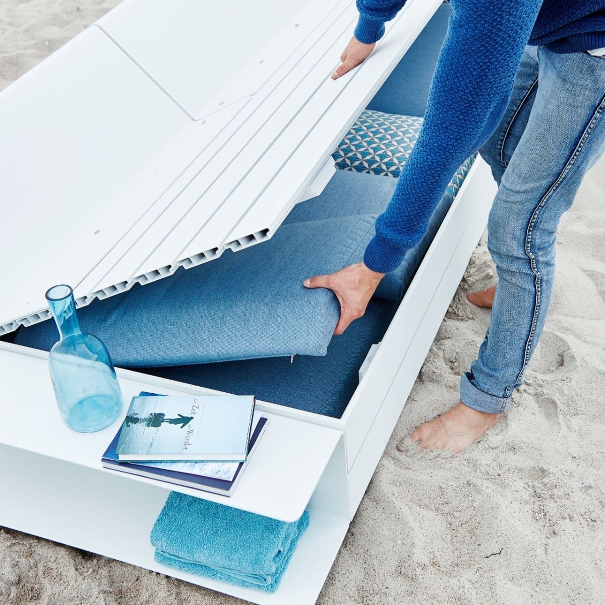 Die Sitzmodule sind mit einer Höhenverstellung ausgestattet und können so nach Wunsch auf Lounge- oder Dining-Höhe montiert werden, zudem bieten sie einen praktischen Stauraum für die Polster.