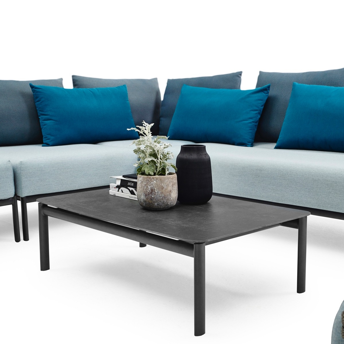 Zwei unterschiedlich hohe Lounge-Tische Aluminium, die beide mit optisch leichten Tischplatten in verschiedenen Keramik-Ausführungen erhältlich sind, vervollständigen die CARO Kollektion.