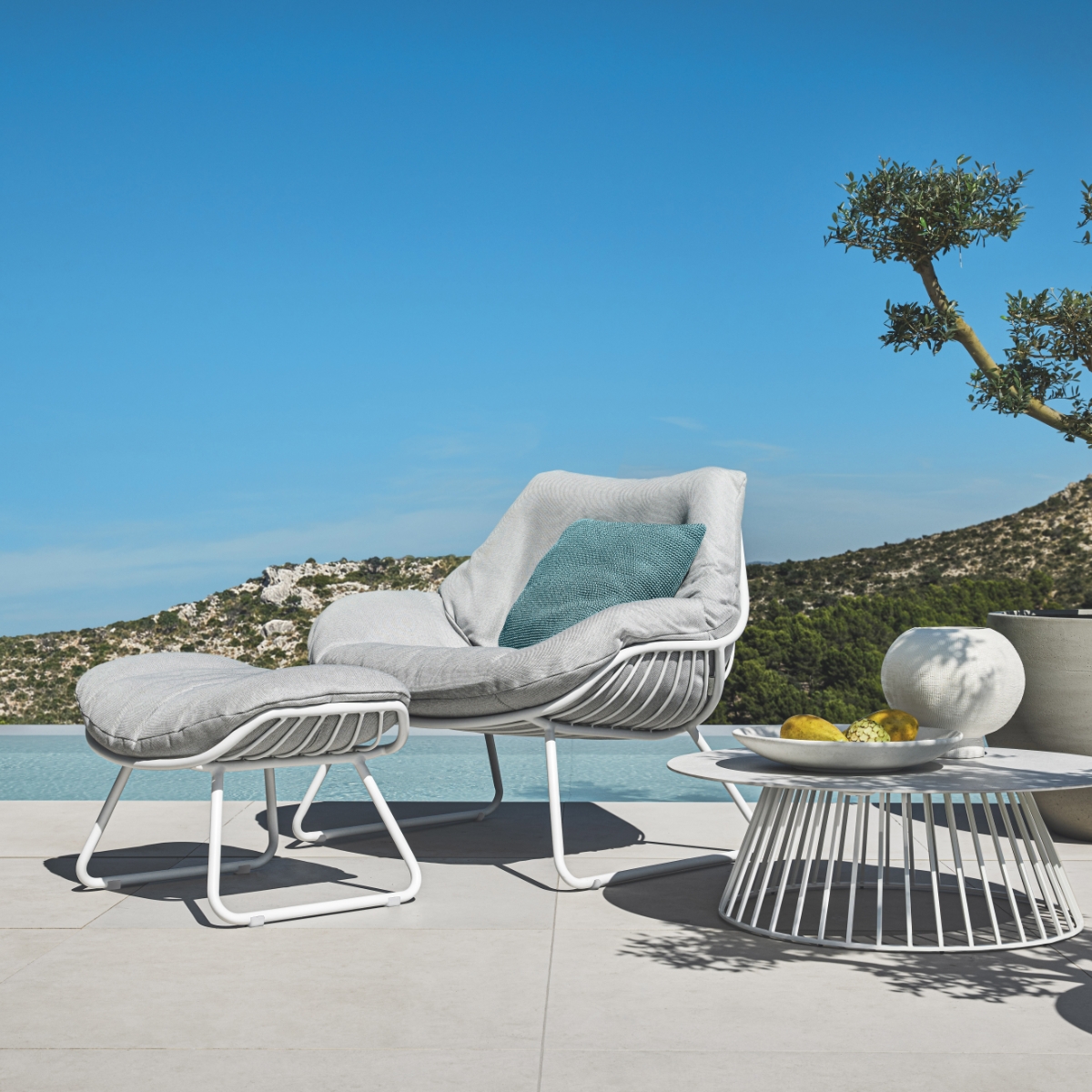 Ausgewogen wird das reduzierte Gestell durch die voluminösen Sitzpolster, die einladend über das Gestell hinausragen und damit eine ganz besondere Gemütlichkeit versprechen. Die weiche Polsterung reicht bis zu den Armlehnen und garantiert so ein Wohlfühlgefühl, das seines gleichen sucht.