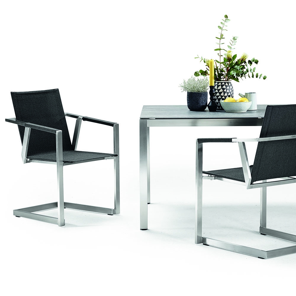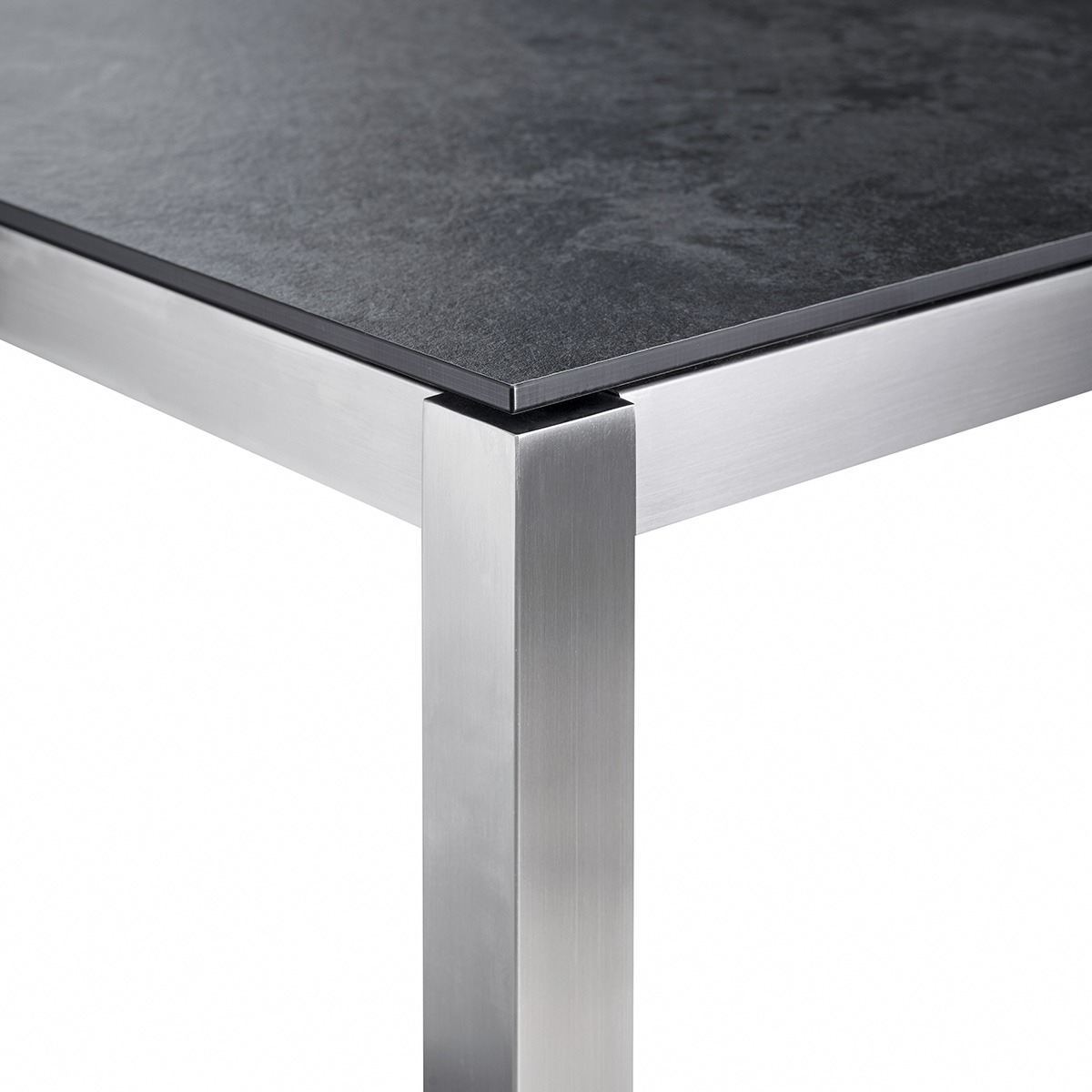 Die wertige Tischplatte des Solpuri CLASSIC Tisch besteht wahlweise aus frostsicherem Dekton oder extrem witterungsbeständigem HPL ('high pressure laminate') und erzeugt eine stilvolle optische Eleganz.