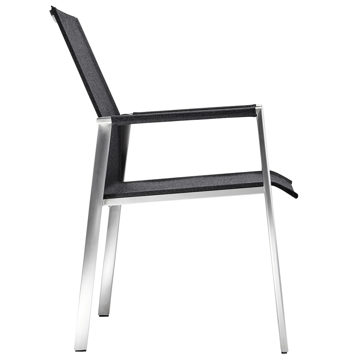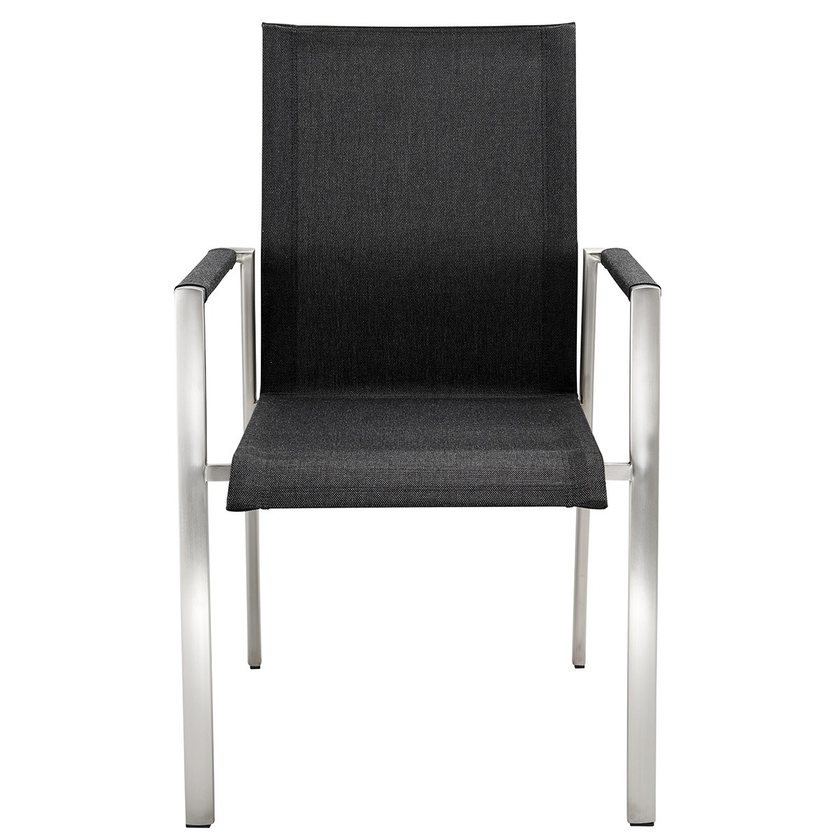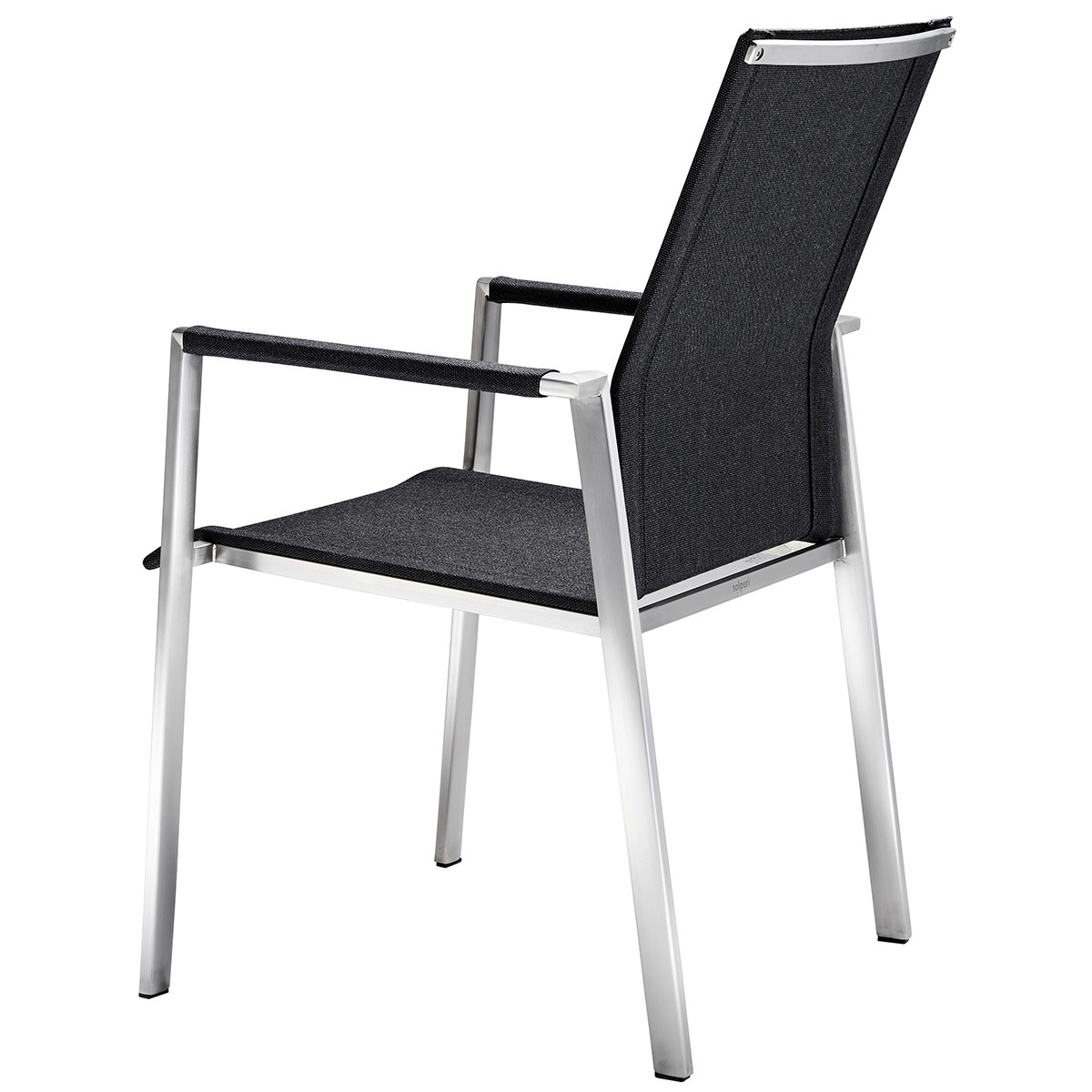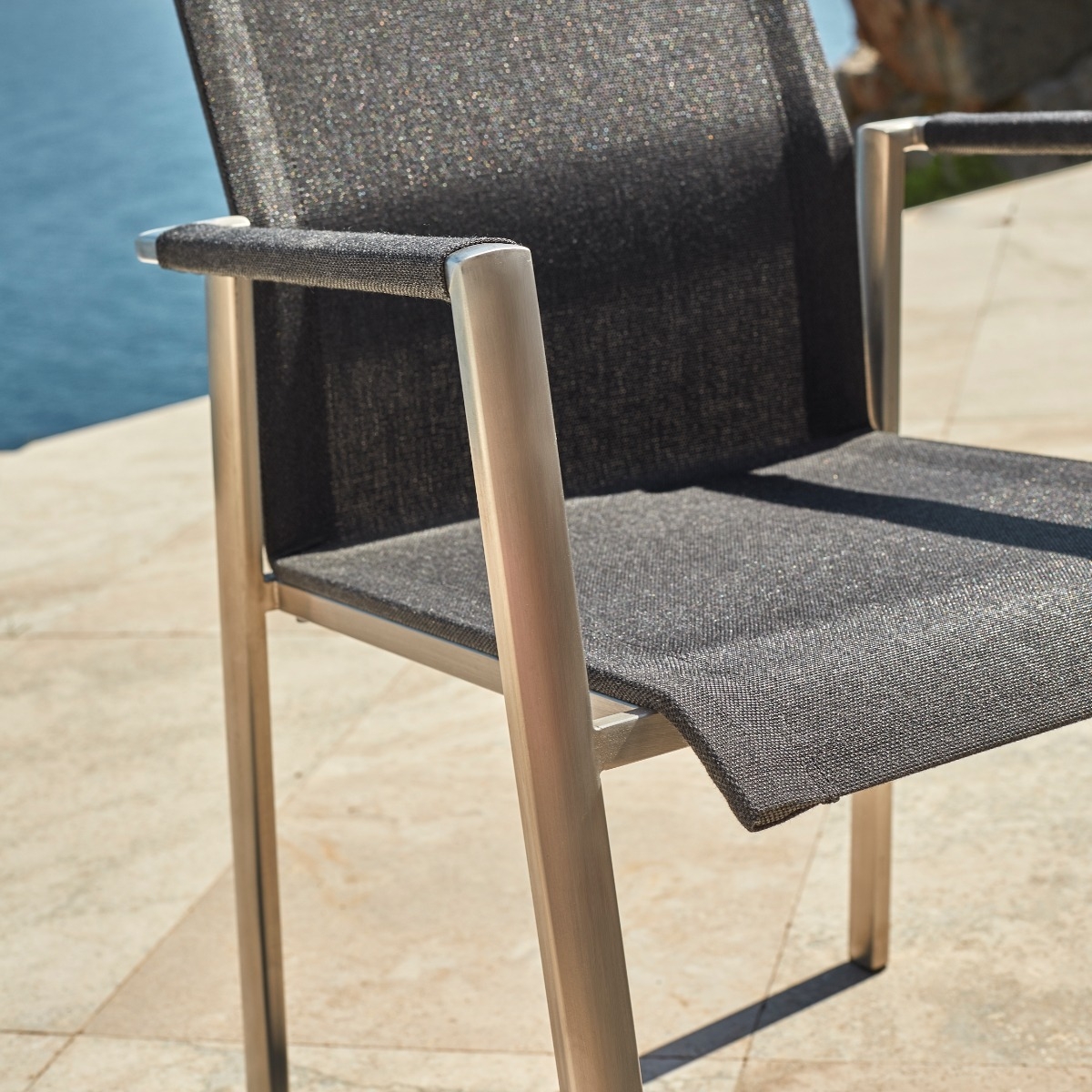 Die breiten, leicht abfallenden Armlehnen des Gartenstuhls aus glattem, per Hand poliertem Edelstahl von besonderer Qualität sind mit Softex ummantelt und sorgen zusammen mit der Sitzfläche aus nachgebendem Softex für besonders hohen Sitzkomfort.