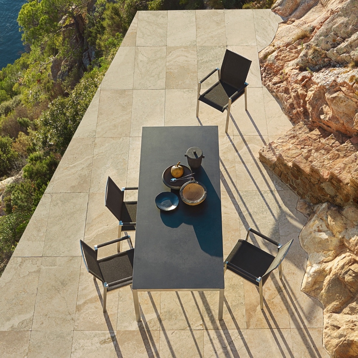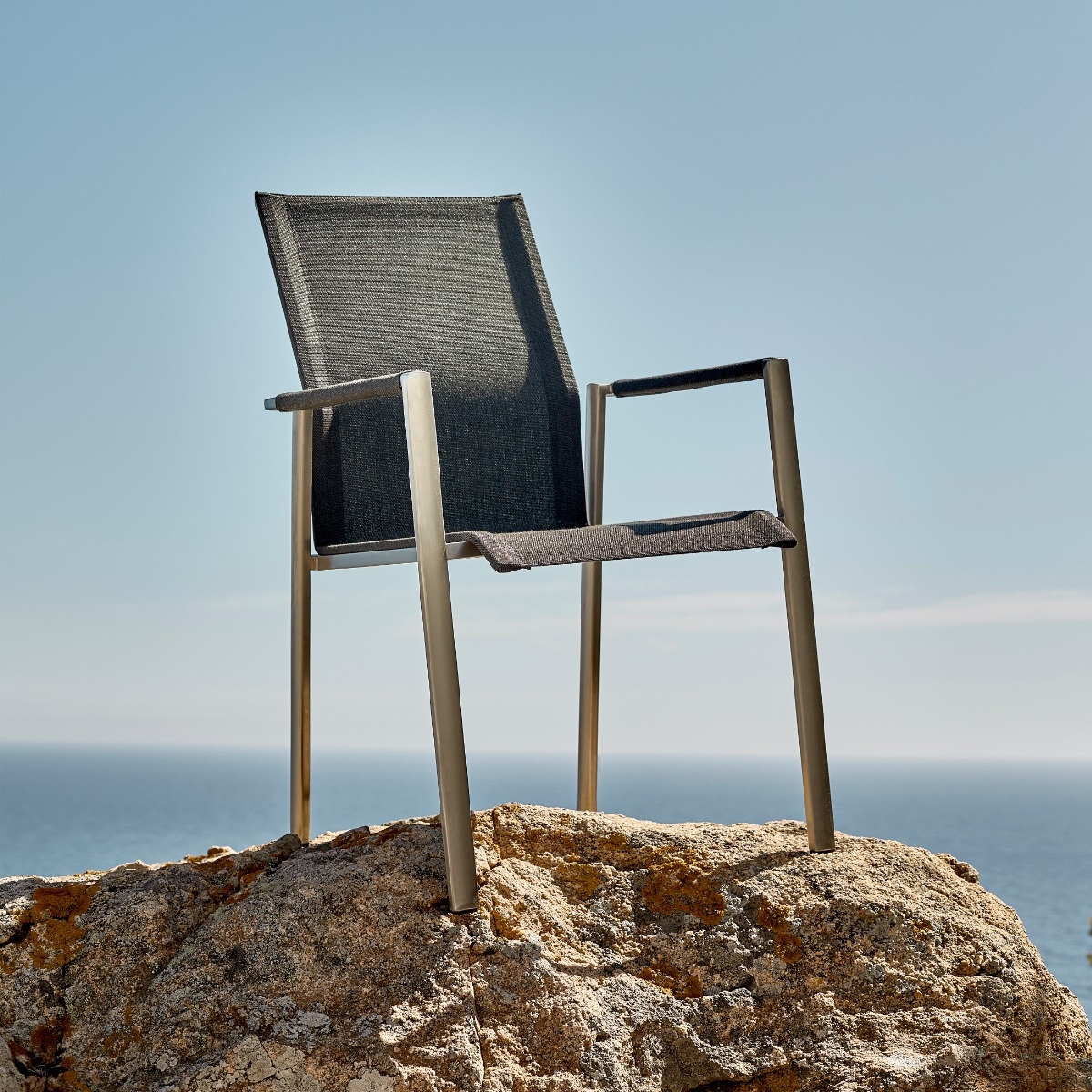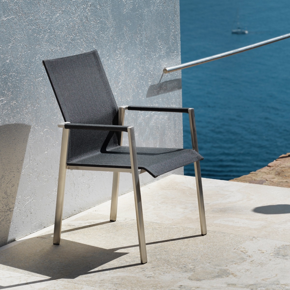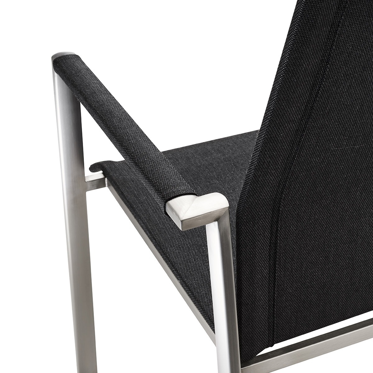 Die breiten, leicht abfallenden Armlehnen des Gartenstuhls aus glattem, per Hand poliertem Edelstahl von besonderer Qualität sind mit Softex ummantelt und sorgen zusammen mit der Sitzfläche aus nachgebendem Softex für besonders hohen Sitzkomfort.