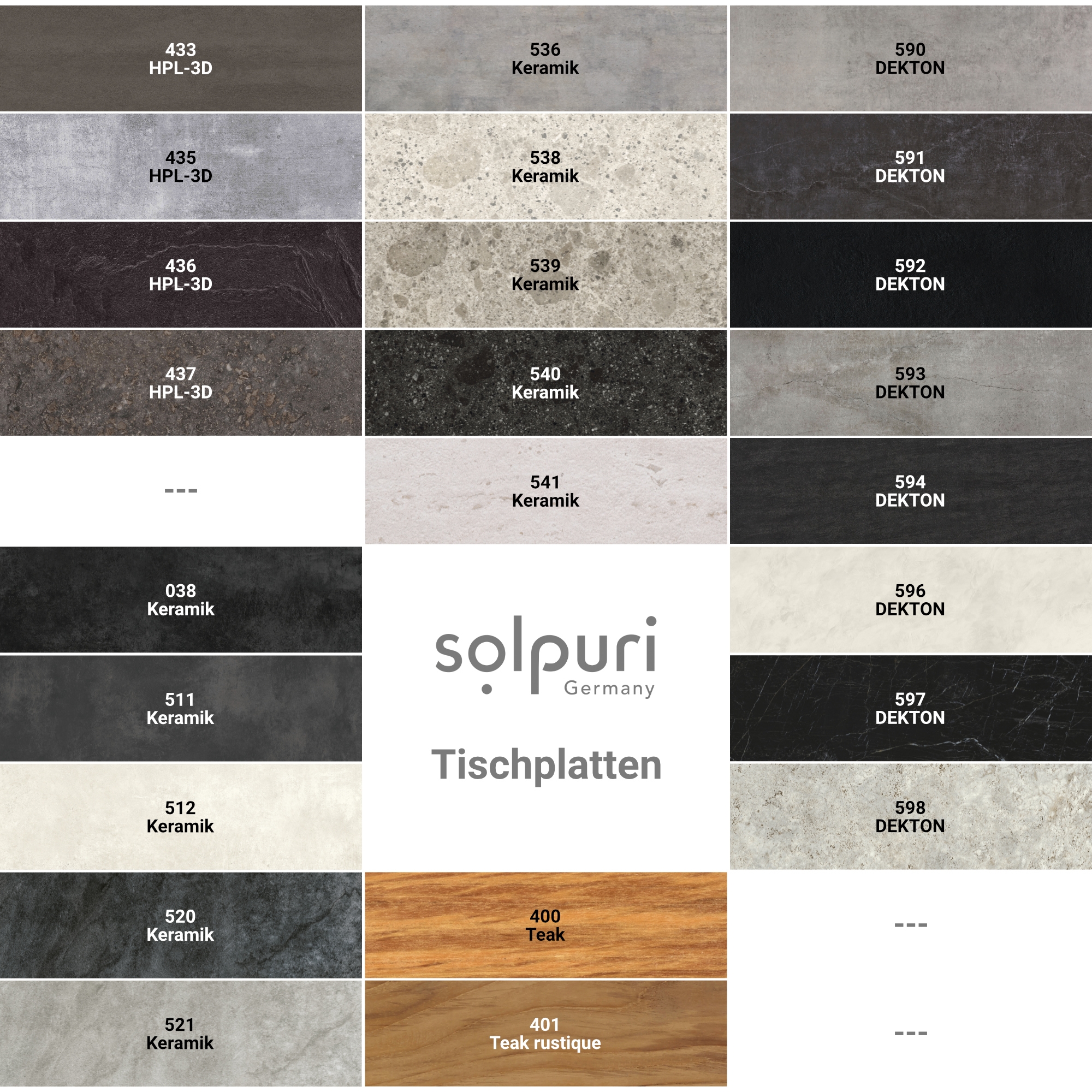 Die solpuri Aluminium-Kollektion wird aus hochwertigen Aluminium-Legierungen gefertigt, die sich durch eine große Festigkeit und Härte auszeichnen. Für die farbliche Beschichtung der Oberflächen wird ein Pulver verwendet, mit dem ein Höchstmaß an Schlag- und Kratzresistenz erzielt wird. Unverwechselbar ist die samtig, matte Oberfläche, die dem Aluminium-Möbel seine edle Optik und angenehme Haptik verleiht.