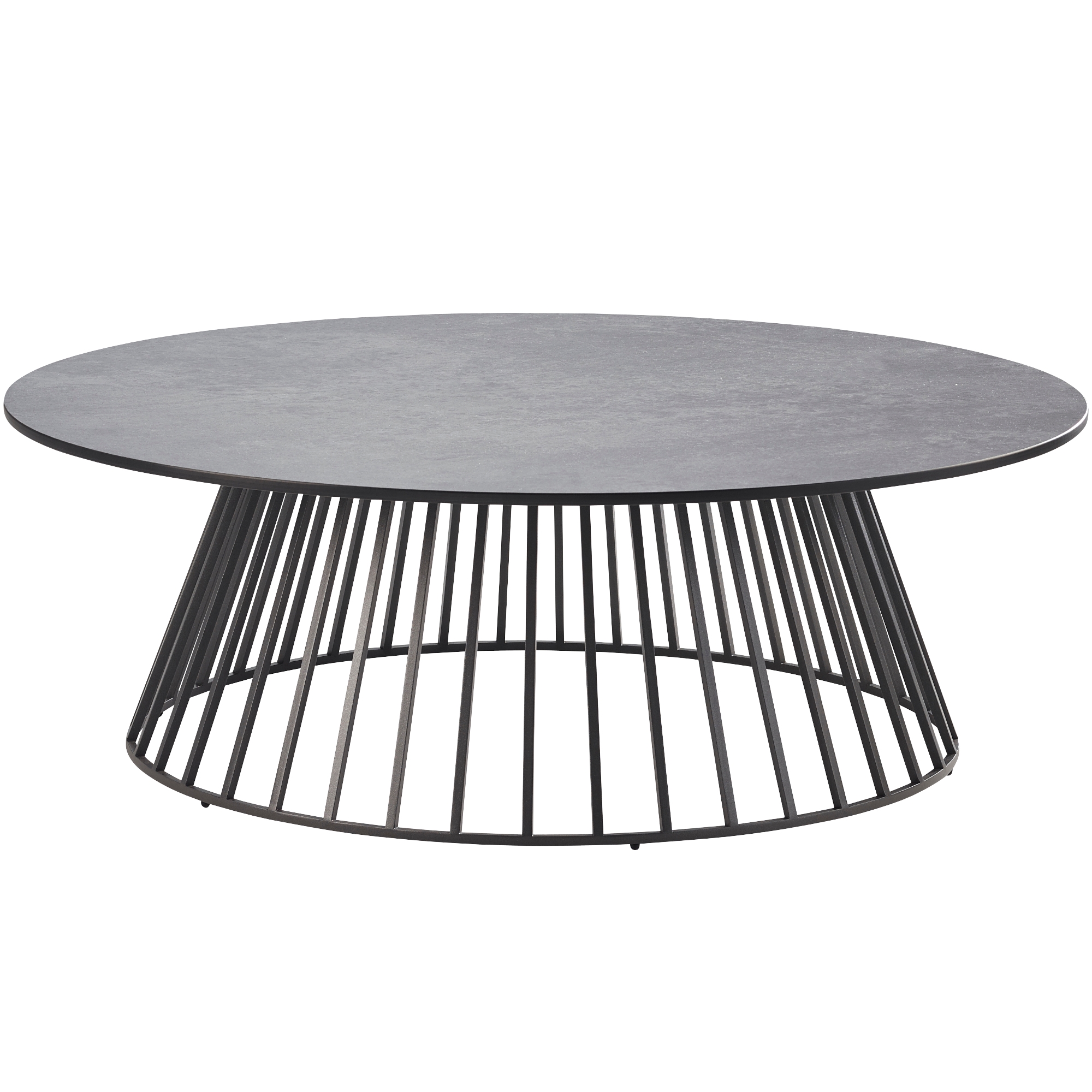 Der stilvolle Solpuri GRID Tisch mit einer Höhe von 30cm und einer großen Tischplatte in 110cm Durchmesser besticht durch das kegelförmige Gittergestell in Industrial Design aus wahlweise anthrazit oder weiß beschichtetem Aluminium.
