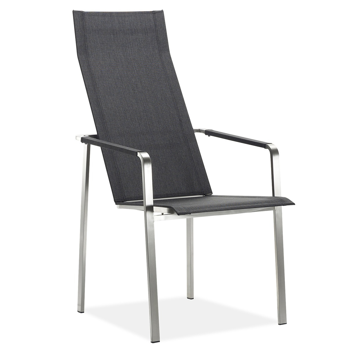 Der komfortable Solpuri JAZZ Hochlehner besticht durch sein poliertes Edelstahlgestell mit weicher Linienführung aus Rohren mit rechteckigem Querschnitt sowie die stilvoll geschnittene Sitzschale aus witterungsbeständigem Softex wahlweise in der Farbe Sand oder Coal.