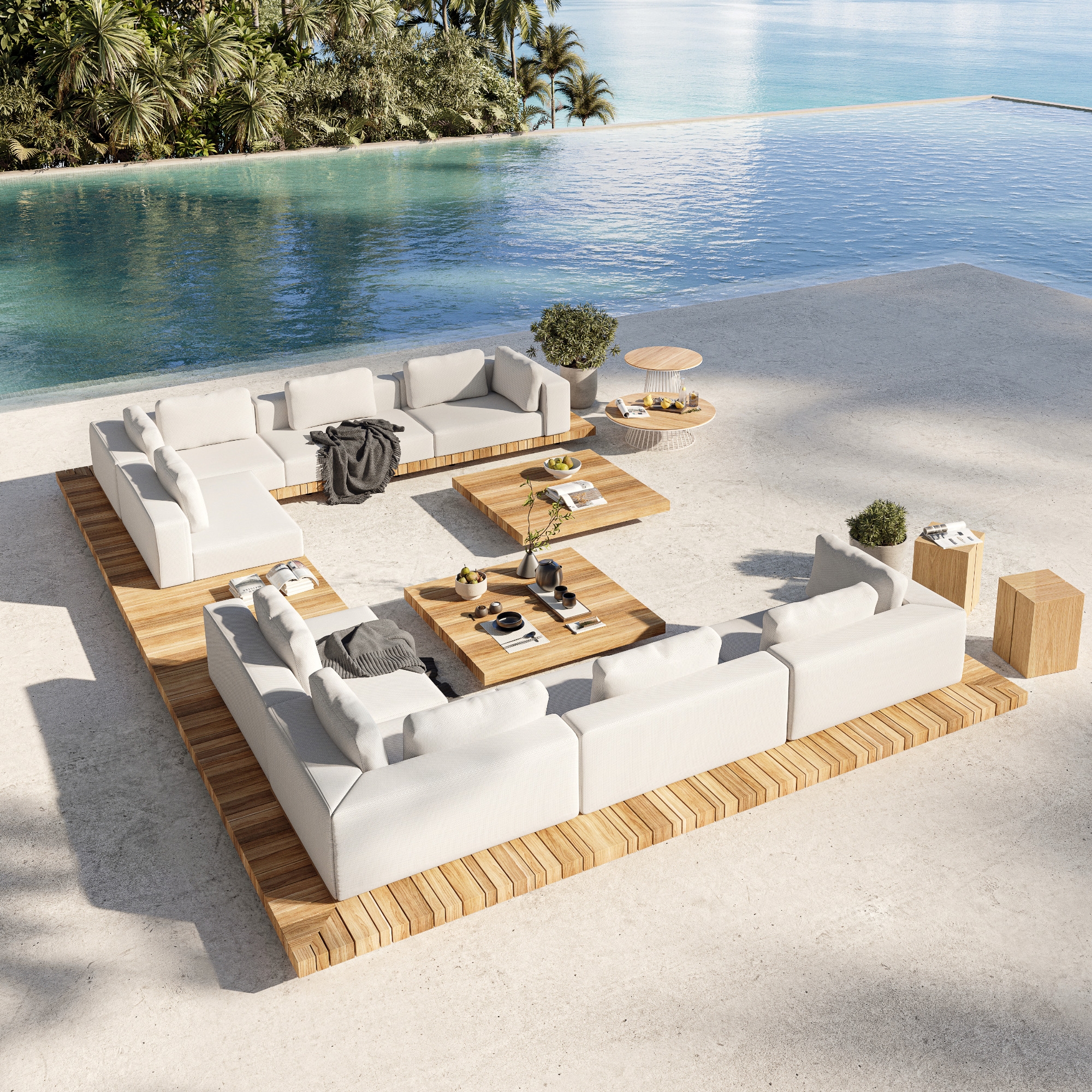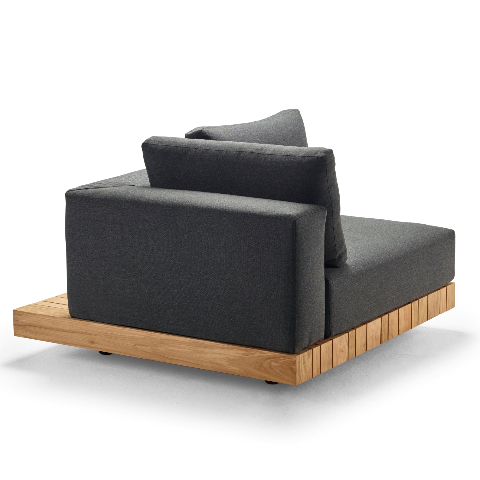 Das Design der Teak-Lounge PLATEAU ist geprägt durch eine optisch schwebende massive Teak-Plattform die eine einladende kubische Polsterlandschaft trägt. Das Teak-Gestell mit unterschiedlich breiten Teak-Latten bildet einen optischen Rahmen für die Polster, welche durch einen innenliegenden Edelstahlrahmen getragen werden.