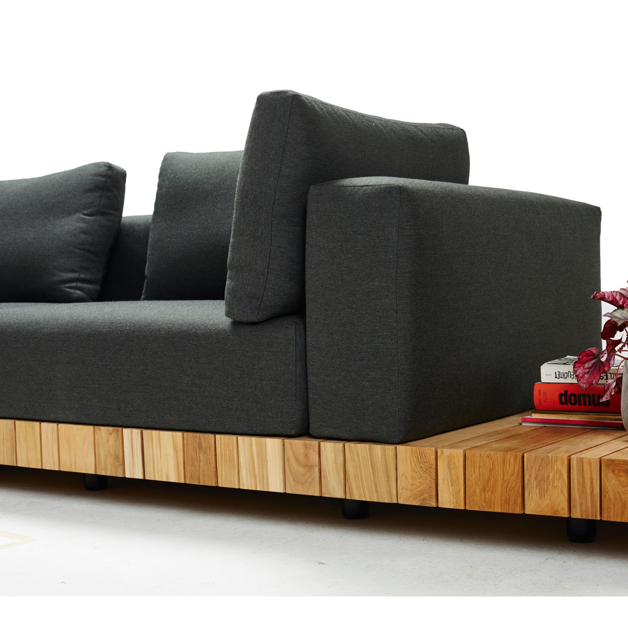 Das Design der Teak-Lounge PLATEAU ist geprägt durch eine optisch schwebende massive Teak-Plattform die eine einladende kubische Polsterlandschaft trägt. Das Teak-Gestell mit unterschiedlich breiten Teak-Latten bildet einen optischen Rahmen für die Polster, welche durch einen innenliegenden Edelstahlrahmen getragen werden.