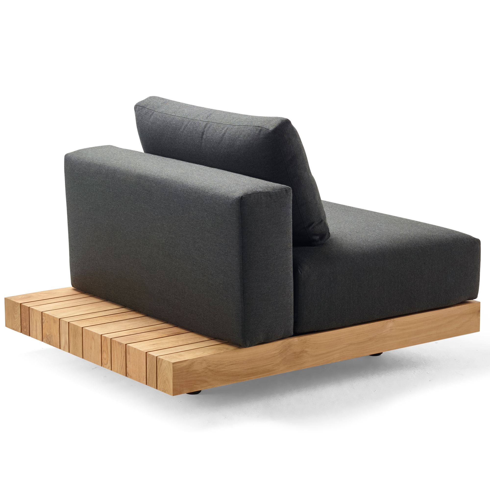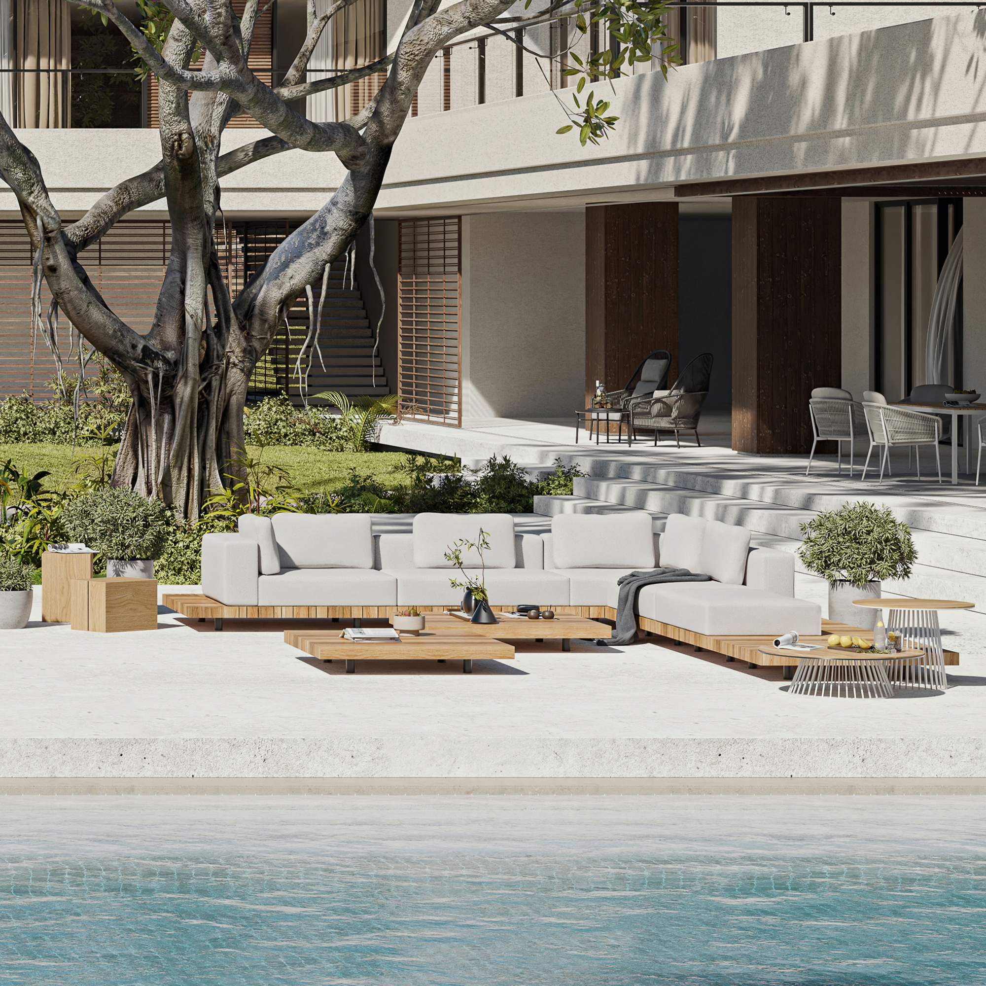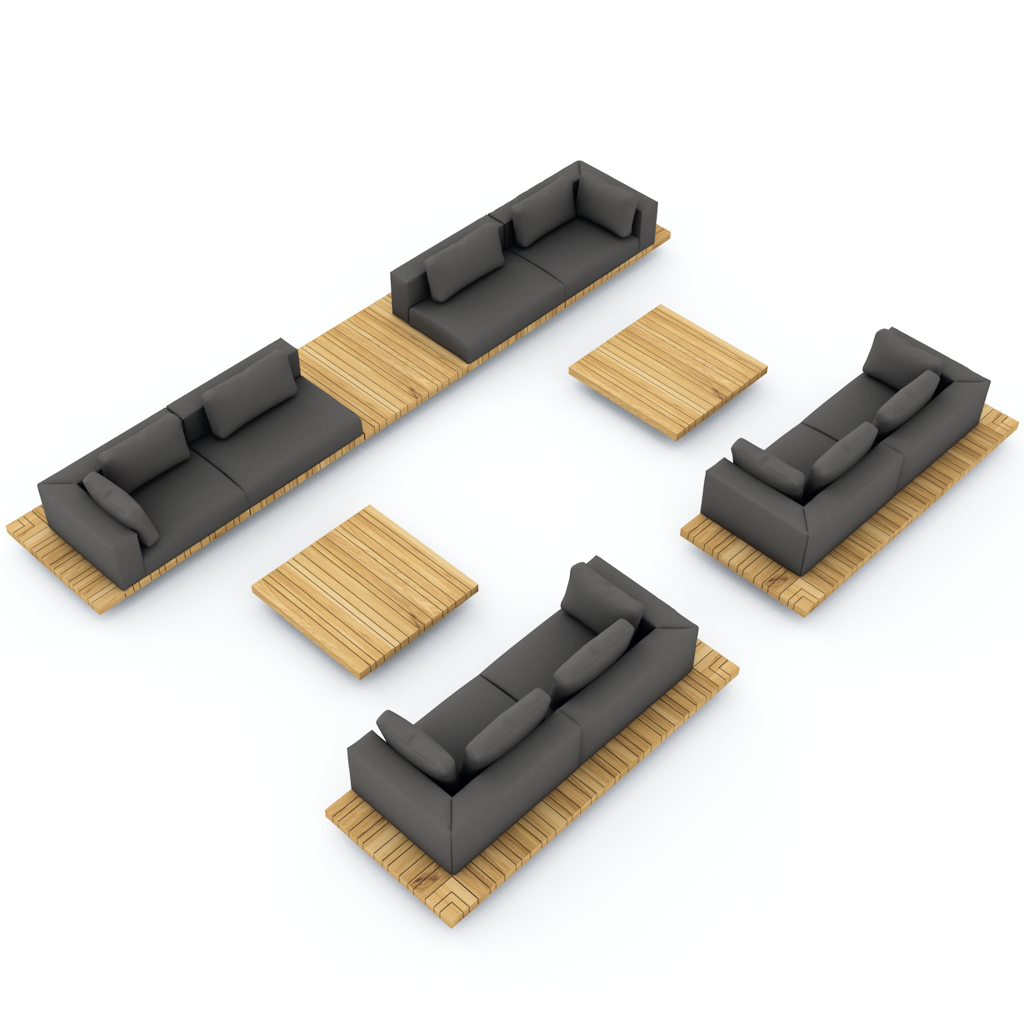 Das Design der Teak-Lounge PLATEAU ist geprägt durch eine optisch schwebende massive Teak-Plattform die eine einladende kubische Polsterlandschaft trägt. Das Teak-Gestell mit unterschiedlich breiten Teak-Latten bildet einen optischen Rahmen für die Polster, welche durch einen innenliegenden Edelstahlrahmen getragen werden.