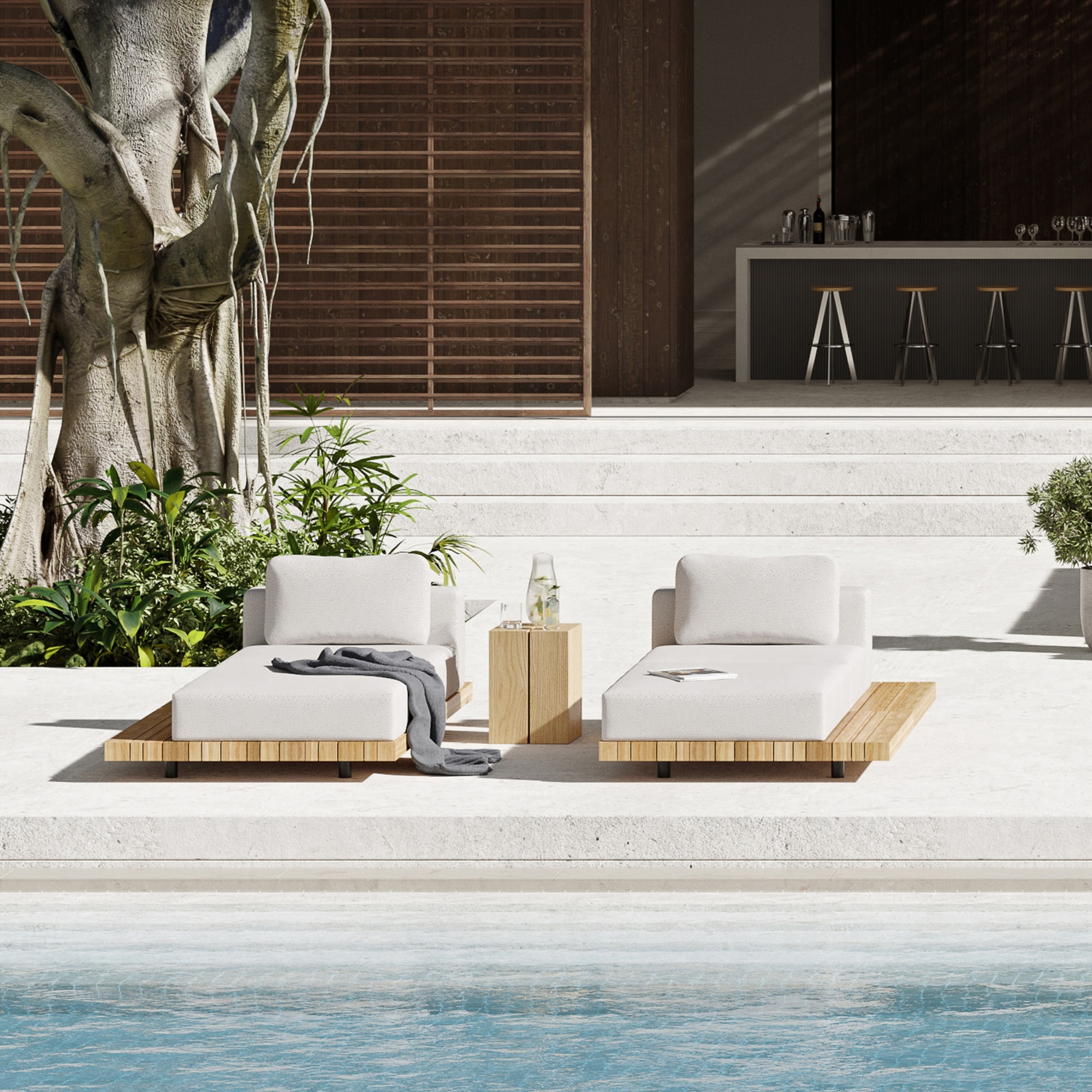 Das Design der Teak-Lounge PLATEAU ist geprägt durch eine optisch schwebende massive Teak-Plattform die eine einladende kubische Polsterlandschaft trägt. Das Teak-Gestell mit unterschiedlich breiten Teak-Latten bildet einen optischen Rahmen für die Polster, welche durch einen innenliegenden Edelstahlrahmen getragen werden.