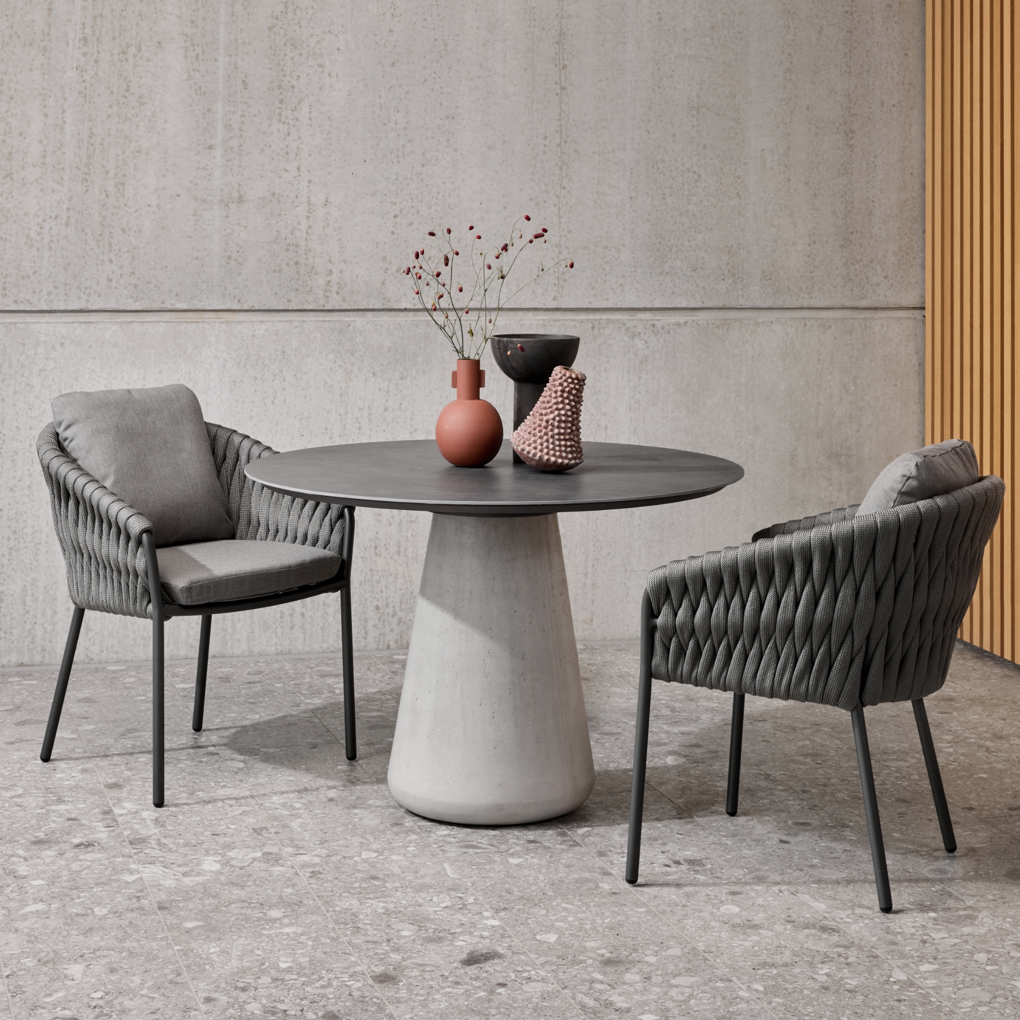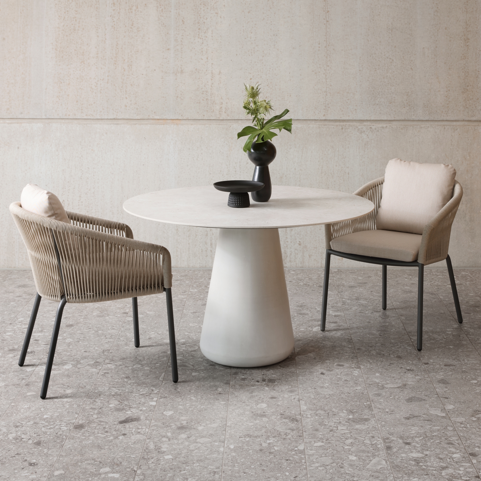 Die Queen Dining Tische verfügen über einen glatten, runden Betonpfeiler. Dieses Alleinstellungsmerkmal hat es bei Solpuri so bisher noch nicht gegeben. Die runde Form von Pfeiler und Platte sowie die schlichte Farbgebung machen die Queen Tische ideal für ein modernes Interieur.